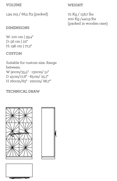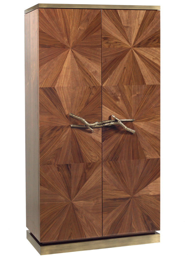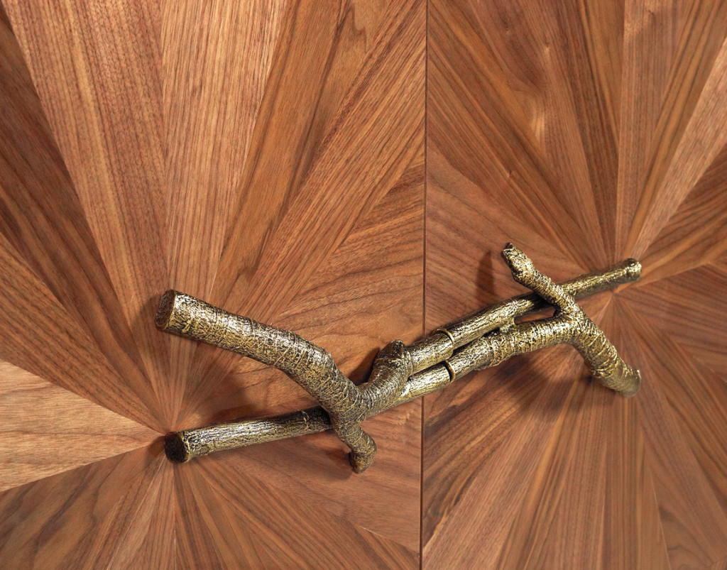 The woodwork of the Walnut Bar Cabinet, made with inlay marquetry technique, evokes the first rays of sunshine passing through naked tree branches. The unique door handles are made from tree branches in brass casting mold.