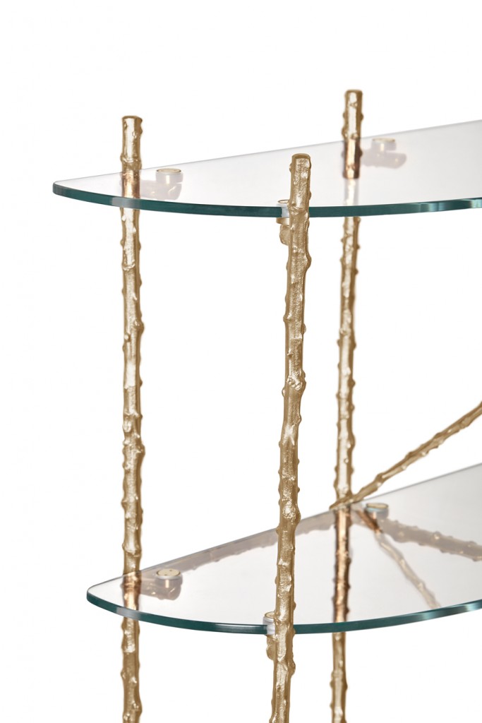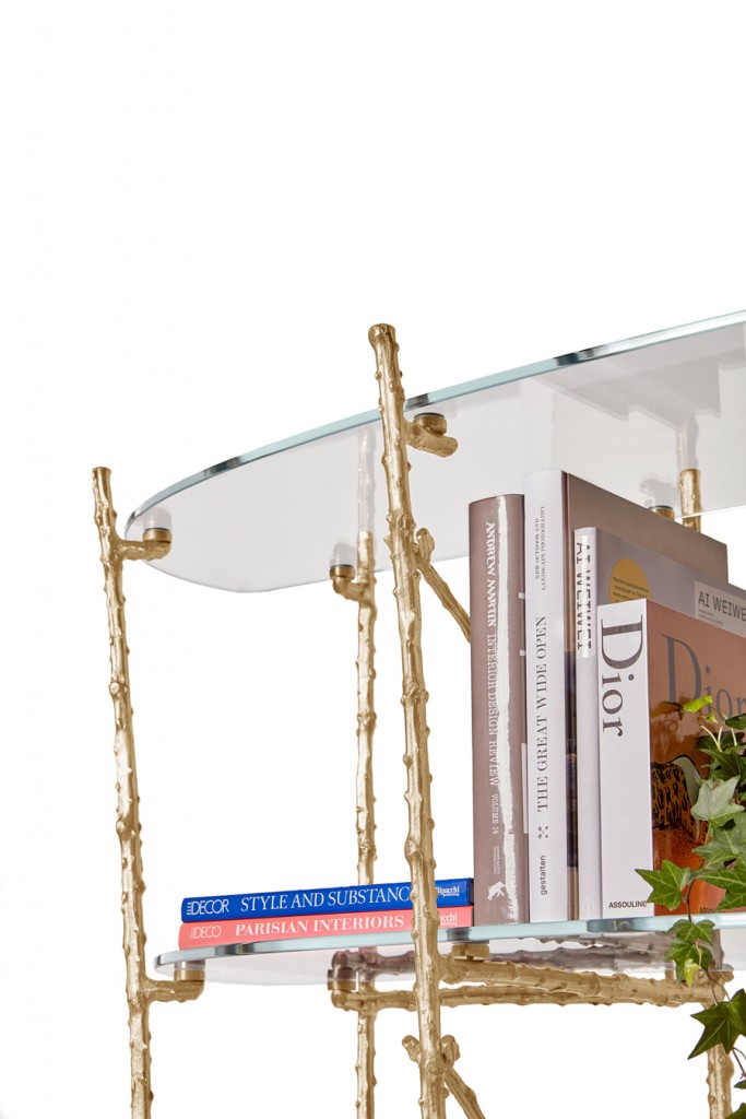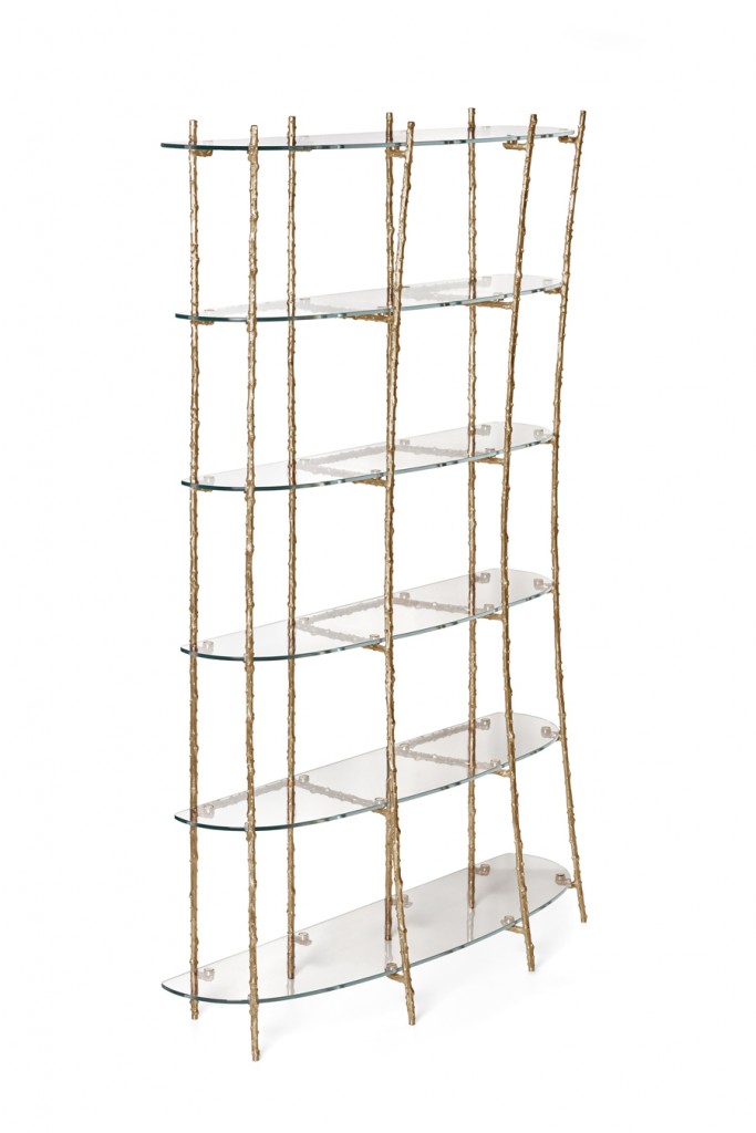 A monument to artisanal wisdom, the Flora Bookcase stands as a graceful memento of branches springing from a quiet river bank. Designed to be filled with ideas, it’s structure is made of tree branches molded in cast brass, with glass shelves that give it a profound sense of lightness.