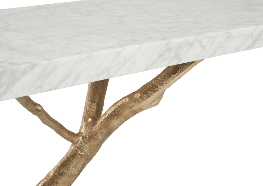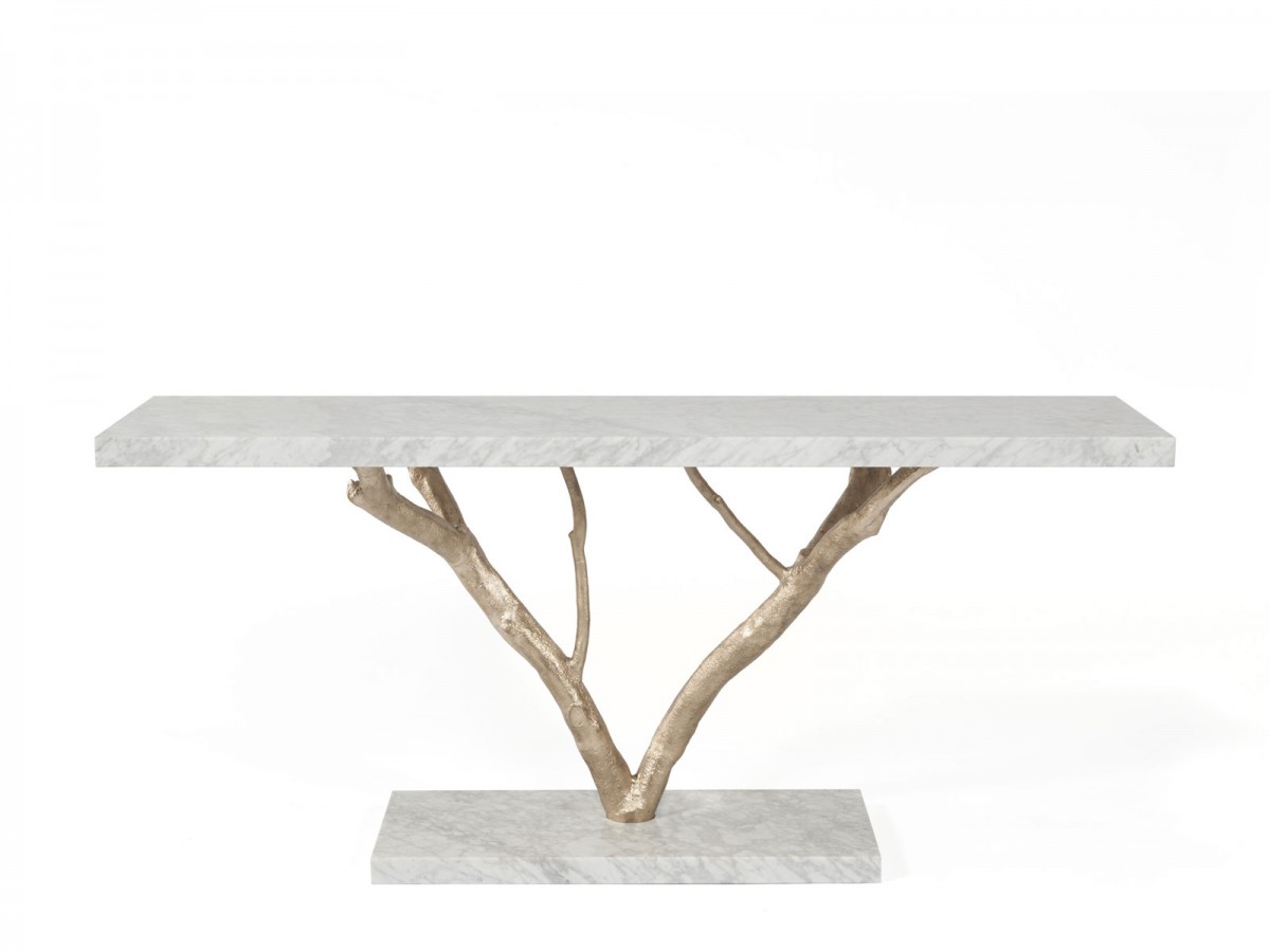 Nature’s forms, materials and textures are immortalized in striking fashion in this piece. The structure is molded in brass casting from magnolia tree branches, providing function to its natural form. The marble base and top deepens the piece’s connection with earthy materials. The softness of the marble and the ruggedness of the textured brass are a testament of Nature’s paradox: complex, yet simple.