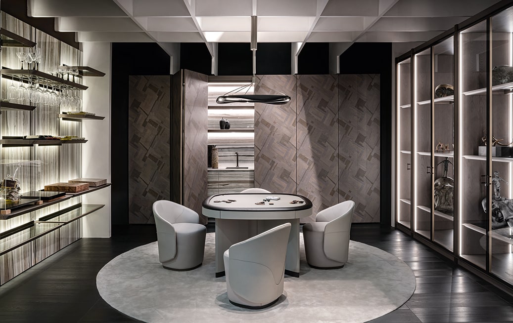 Design born from the idea of reusing Giorgetti's wood scraps, combined together to enhance their biodiversity. The decoration must be arranged in panels, placed side by side.