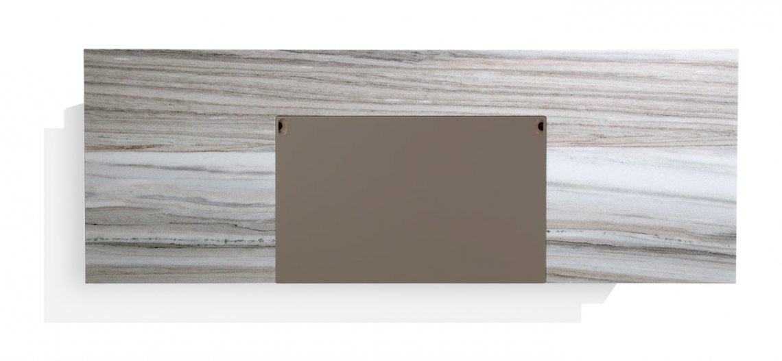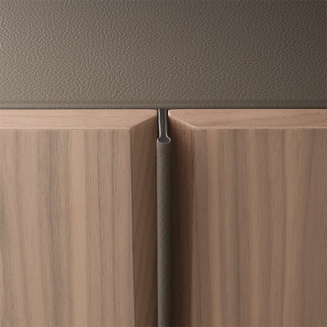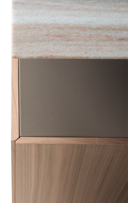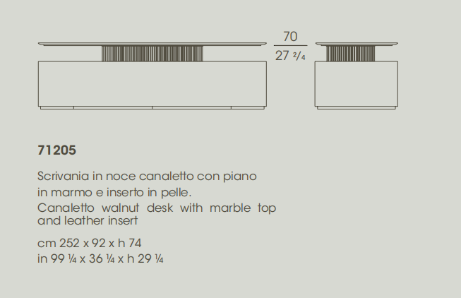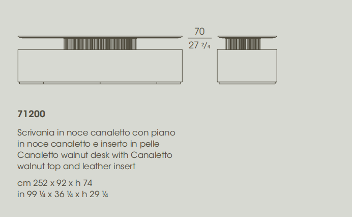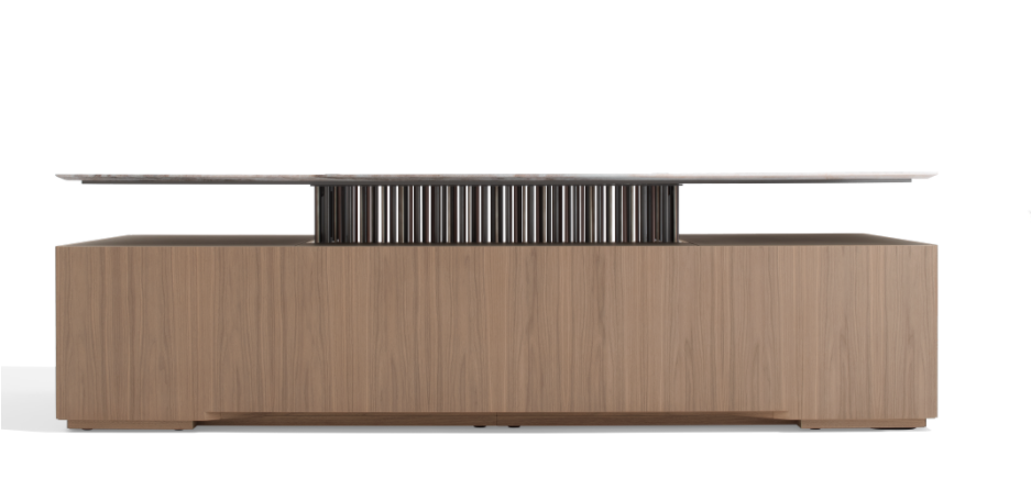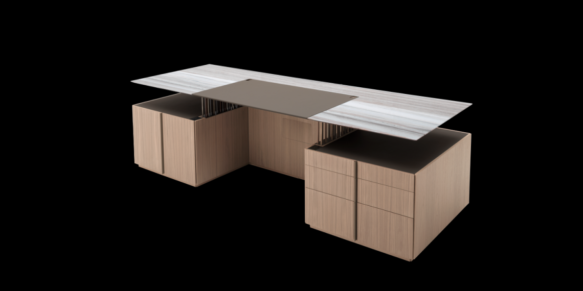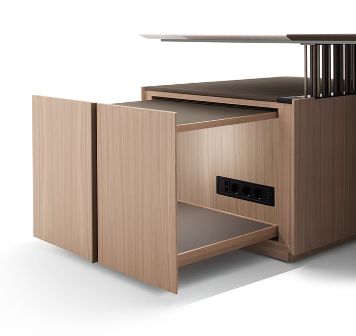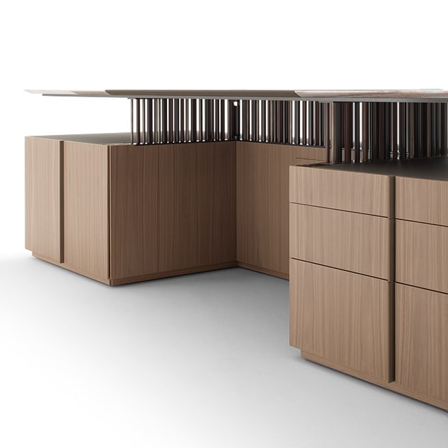 Executive desk with a Canaletto walnut structure and top supported by a metal structure with 158 cylinders in three different sizes and finishes, with lighting and electrification systems.