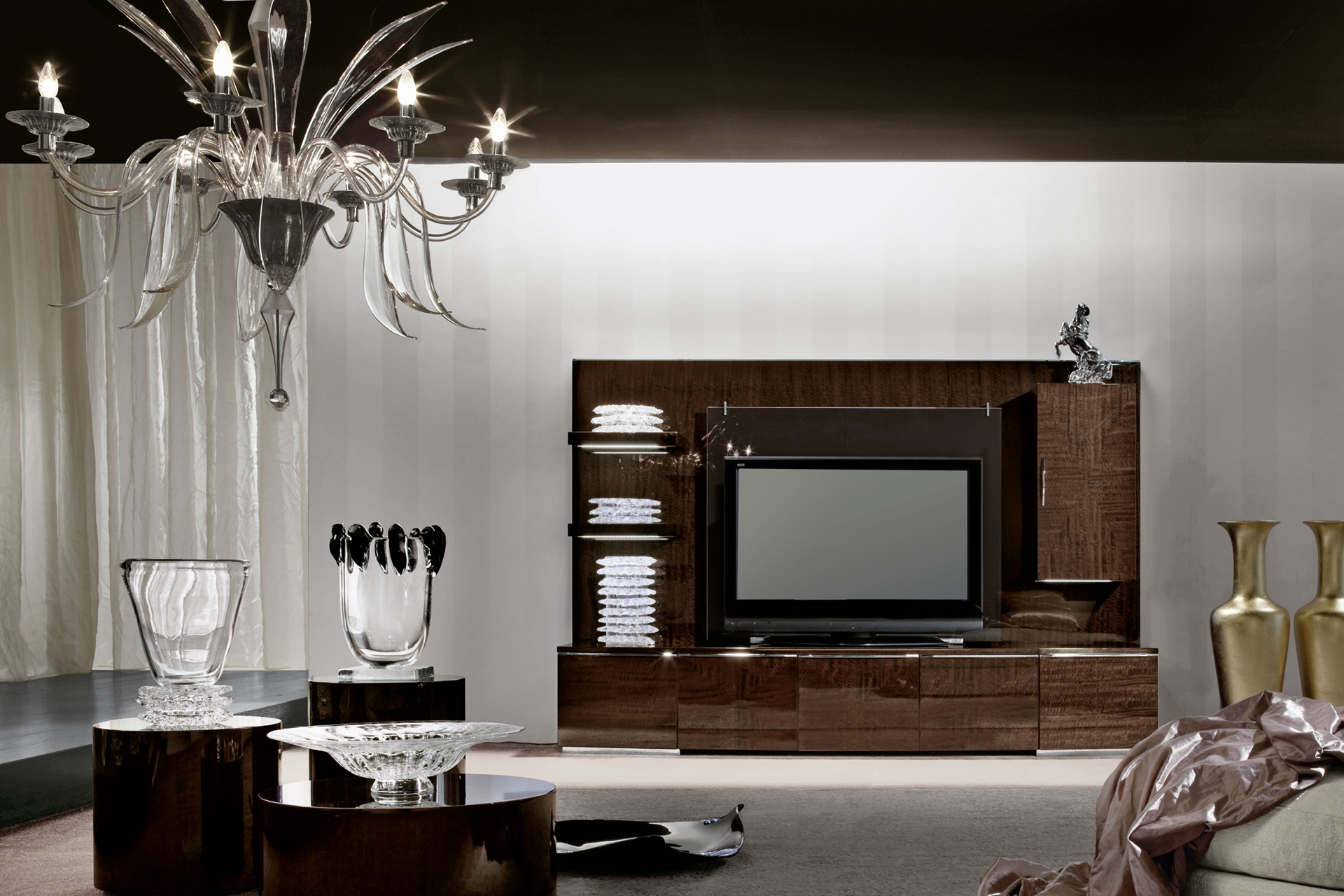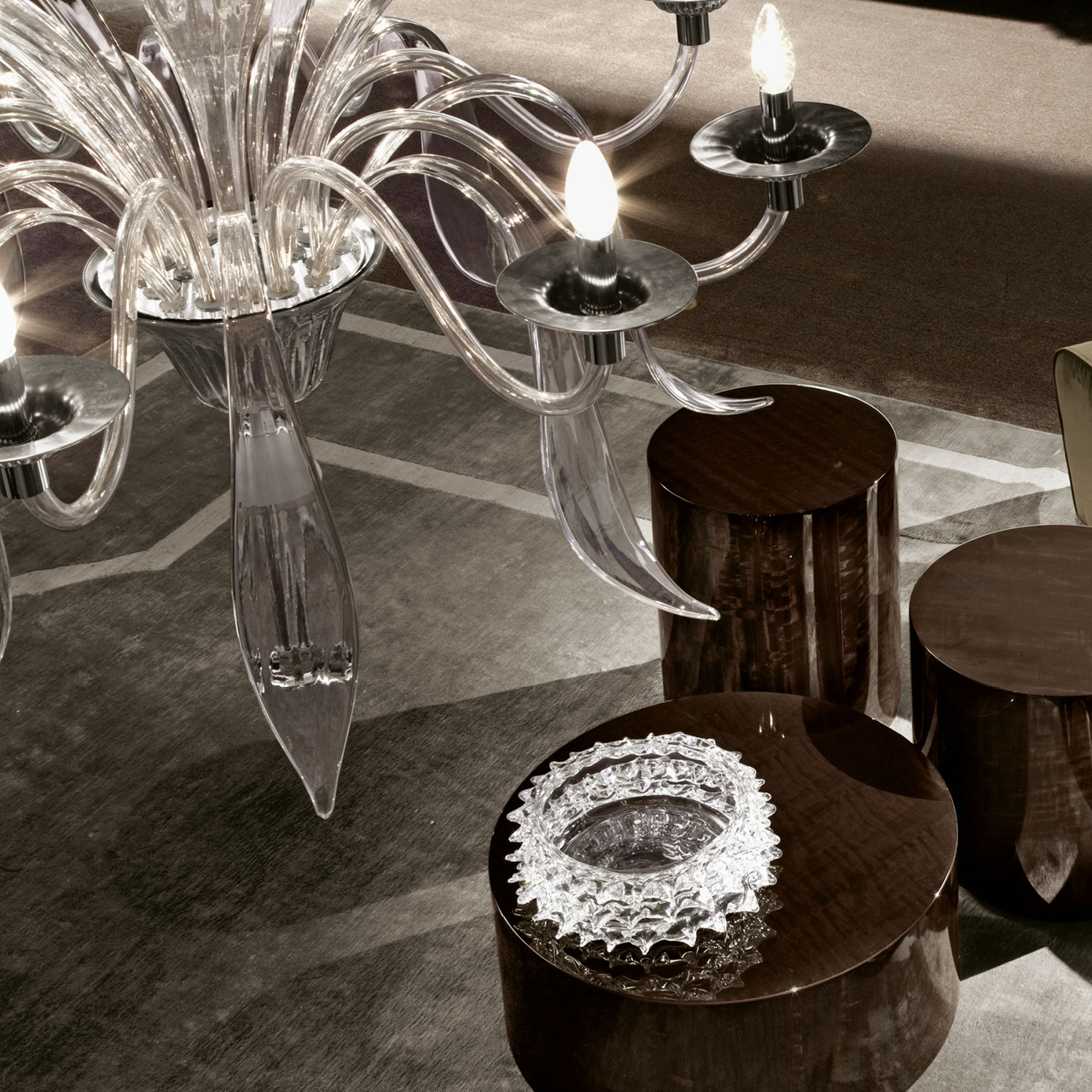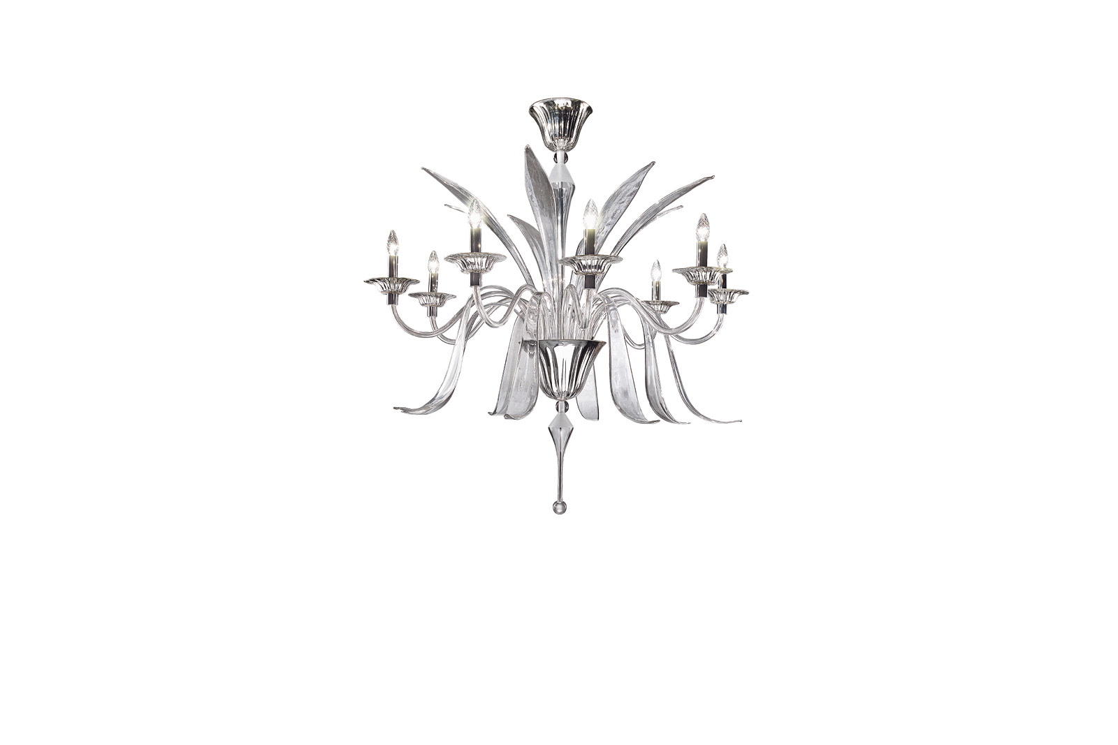 Venetian "Murano" Decò round chandelier with blow clear and silver glasses with 8 lights.