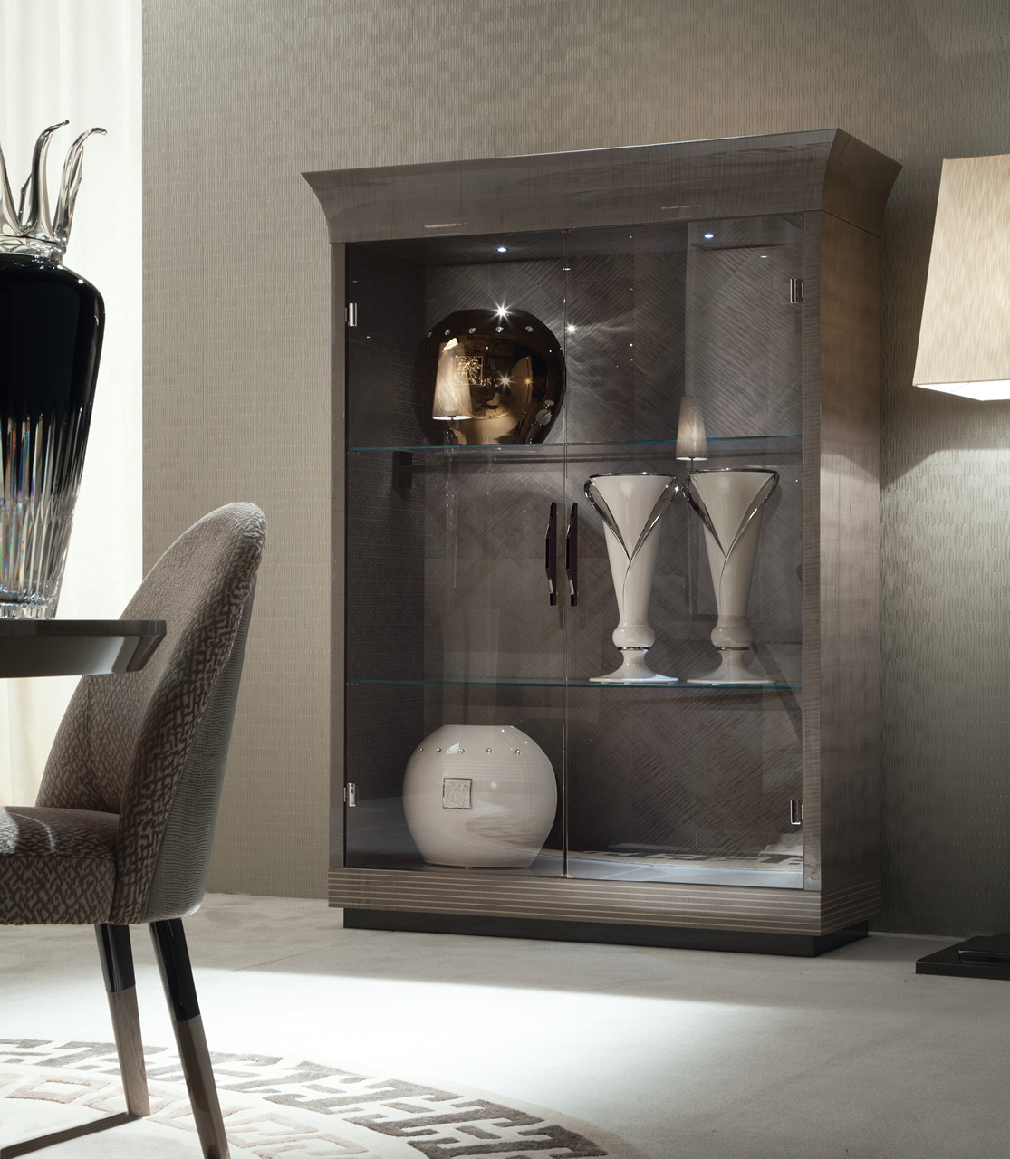 Vetrine with 2 tempered glass doors with combination of tiger African sycomore veneer with high gloss polyester finish and storm dark grey finish stainless steel handles and base. 2 inside adjustable glass shelves. 2 halogene led lights including switch.