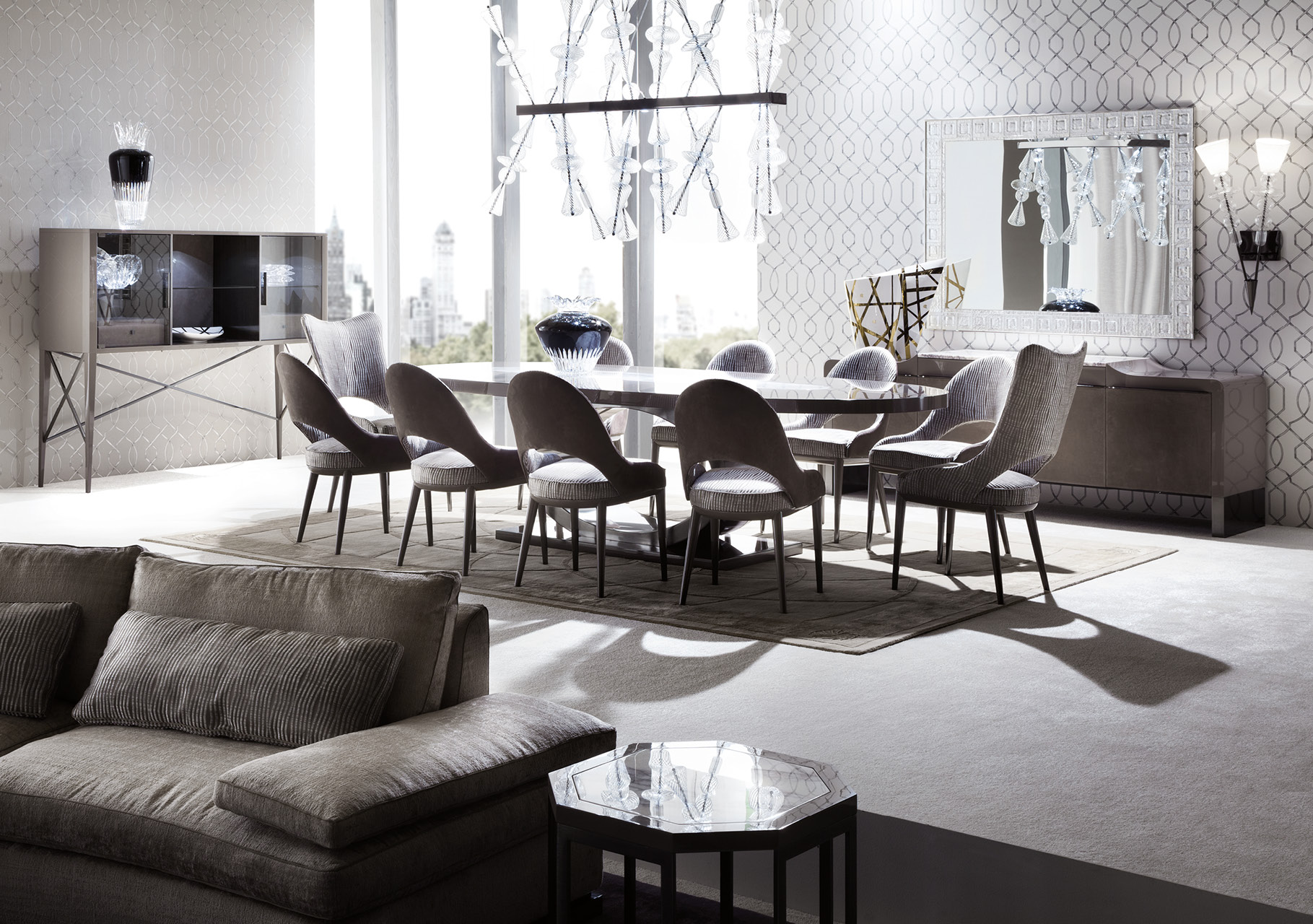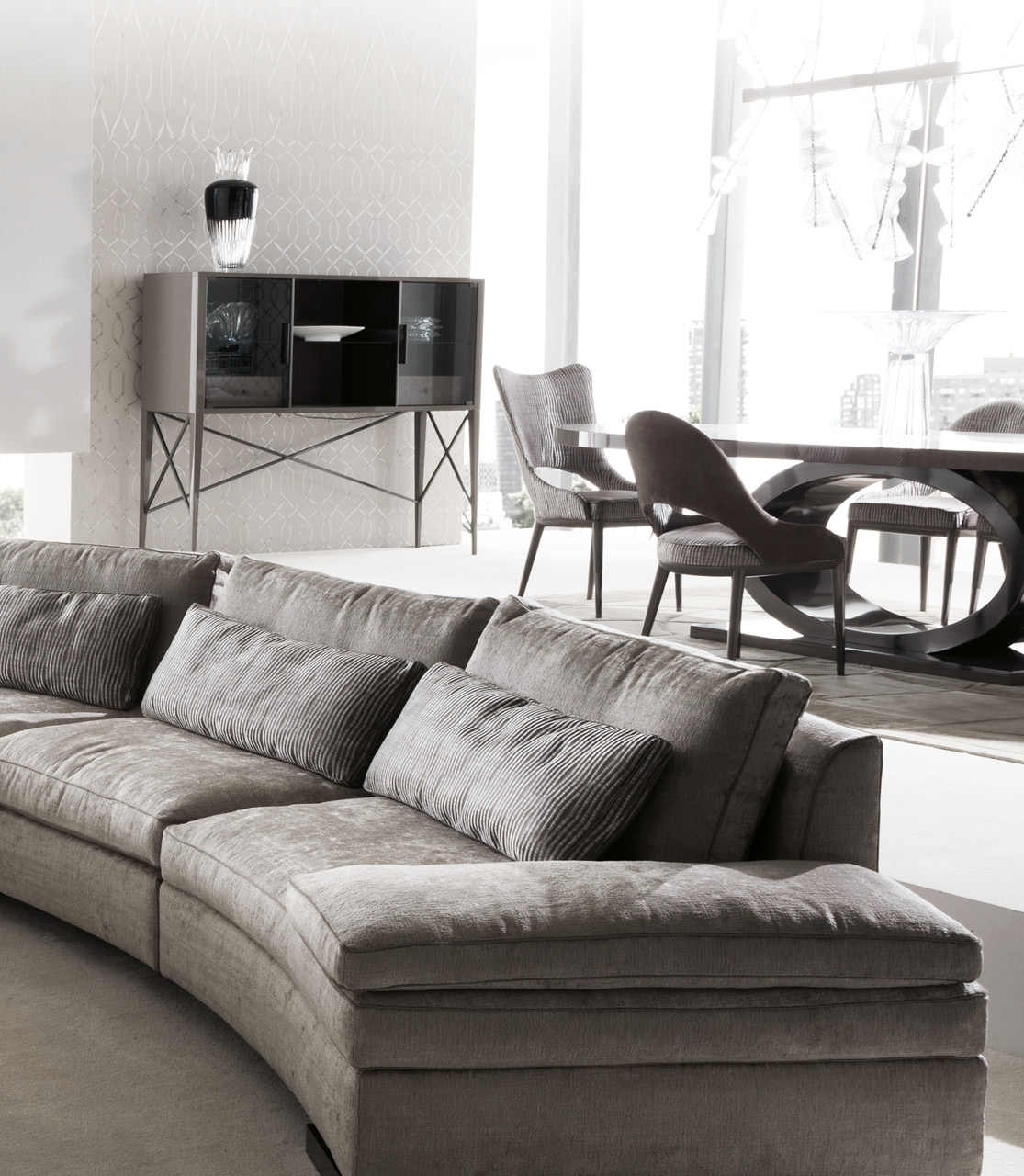 2 glass doors with back of the center part upolstered in natural protected nubuk leather with Giorgio Collection logo insert. Back central panel in natural protected nubuk leather with Giorgio Collection logo insert. 2 interior full extension drawers with front in natural protected nubuk leather, bottom part in velvet fabric. 3 glass adjastable interior shelves. Details, legs and 2 handles in black nickel steel.