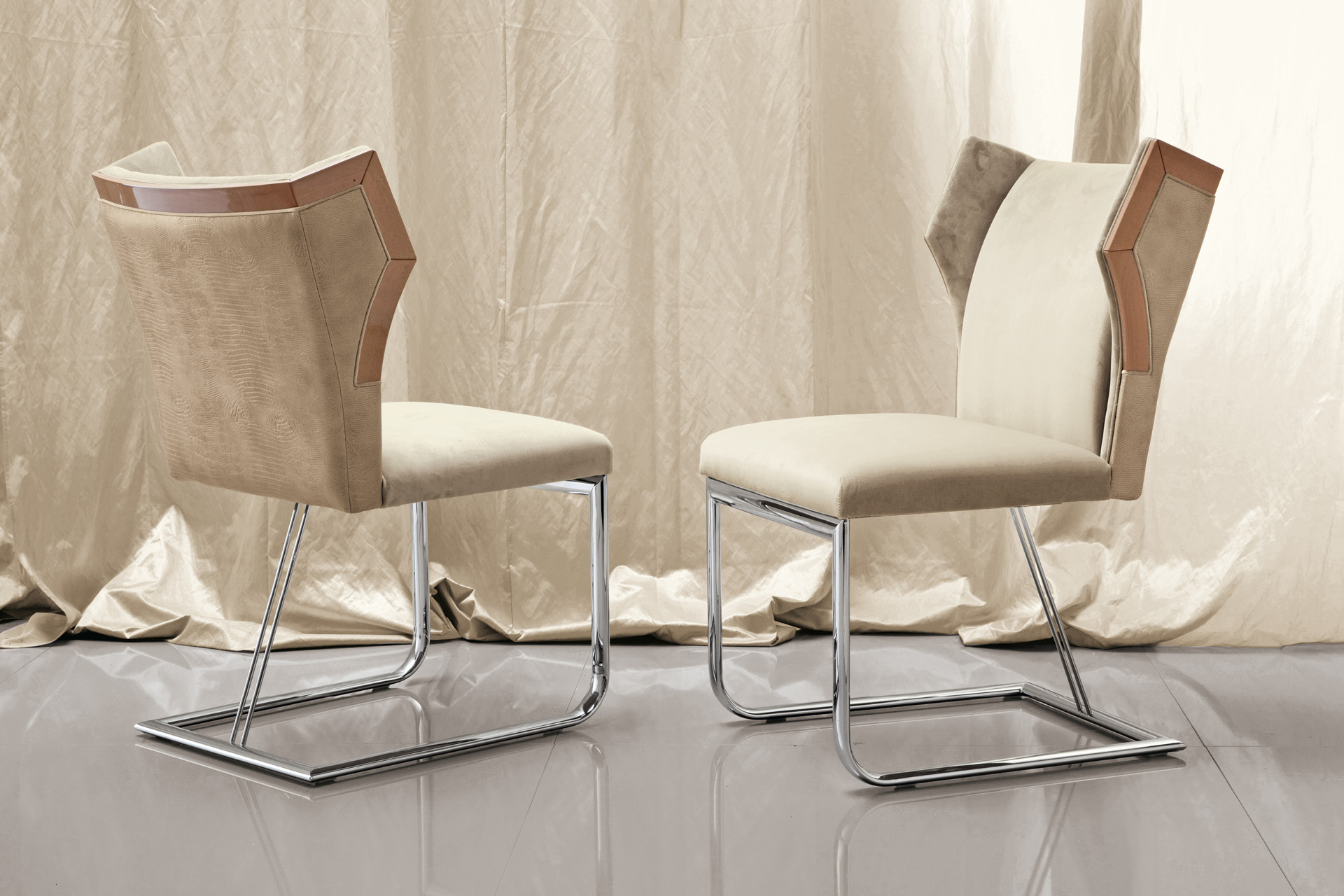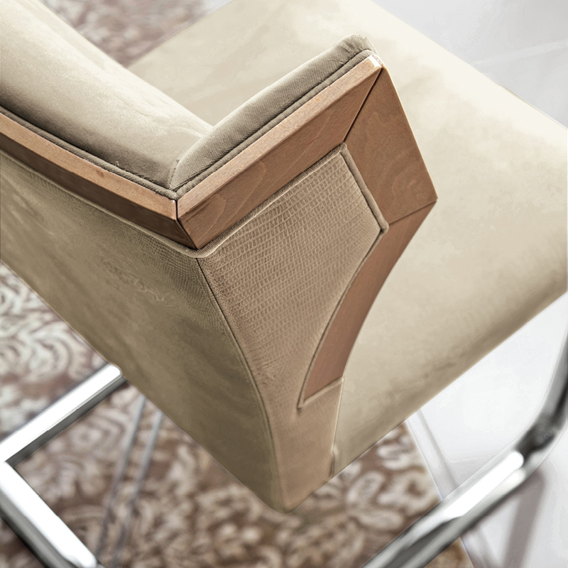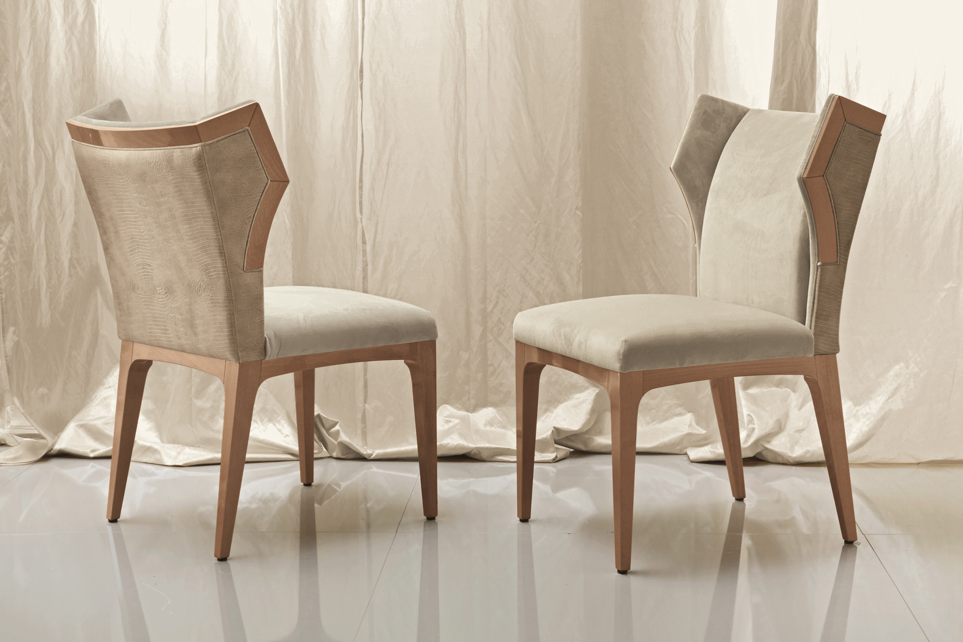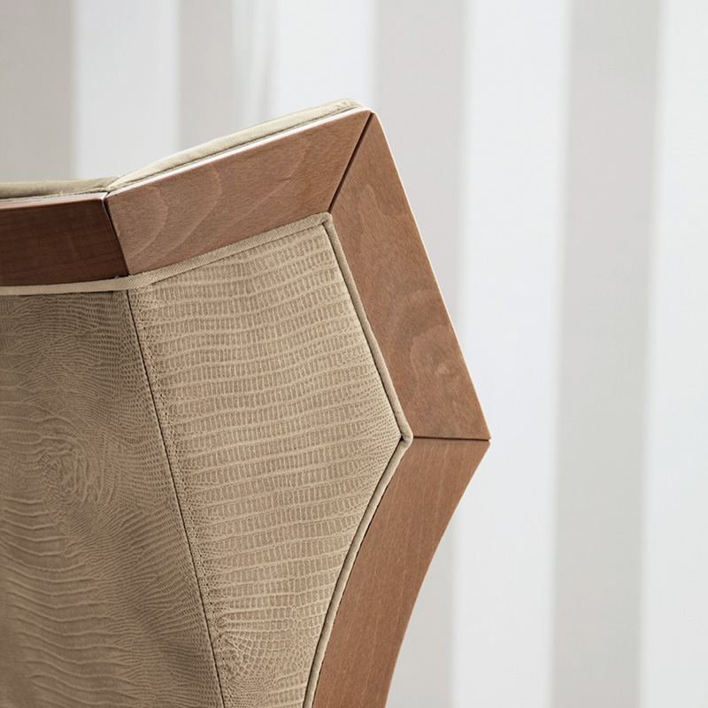 Side chair in bleached solid beech wood with back and seat in combination of printed iguana leather and velvet or suede fabric. Base with 4 legs in wood. Fabric needs for seat inside/back: mt. 1,4 Leather needs for outside/back:mt. 1,4