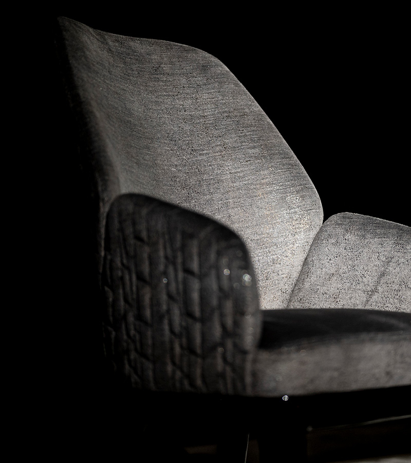 Fully upolstered side arm chair in solid beech. 4 legs with details in gold chrome stainless steel. Wooden base with Giorgio Collection metal logo.