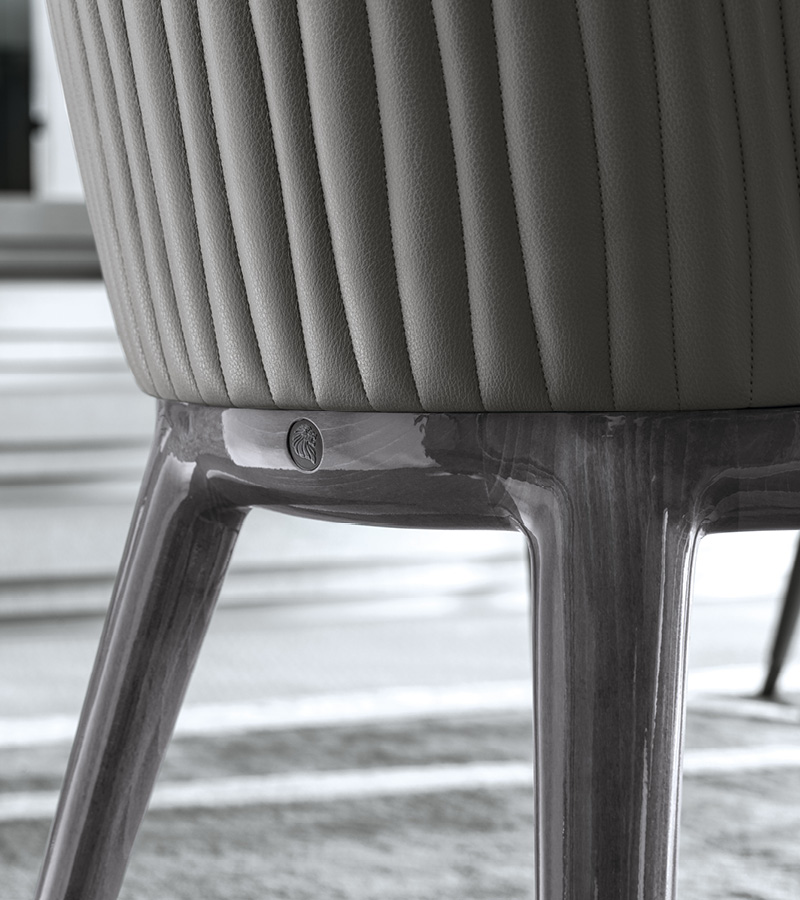 Fully upholstered side chair in solid beech. Back in quilted first grade leather, nubuk leather, lizard printed leather, velvet or suede fabric. Wooden base with Giorgio Collection logo. 4 legs with details in satin black nickel stainless steel.