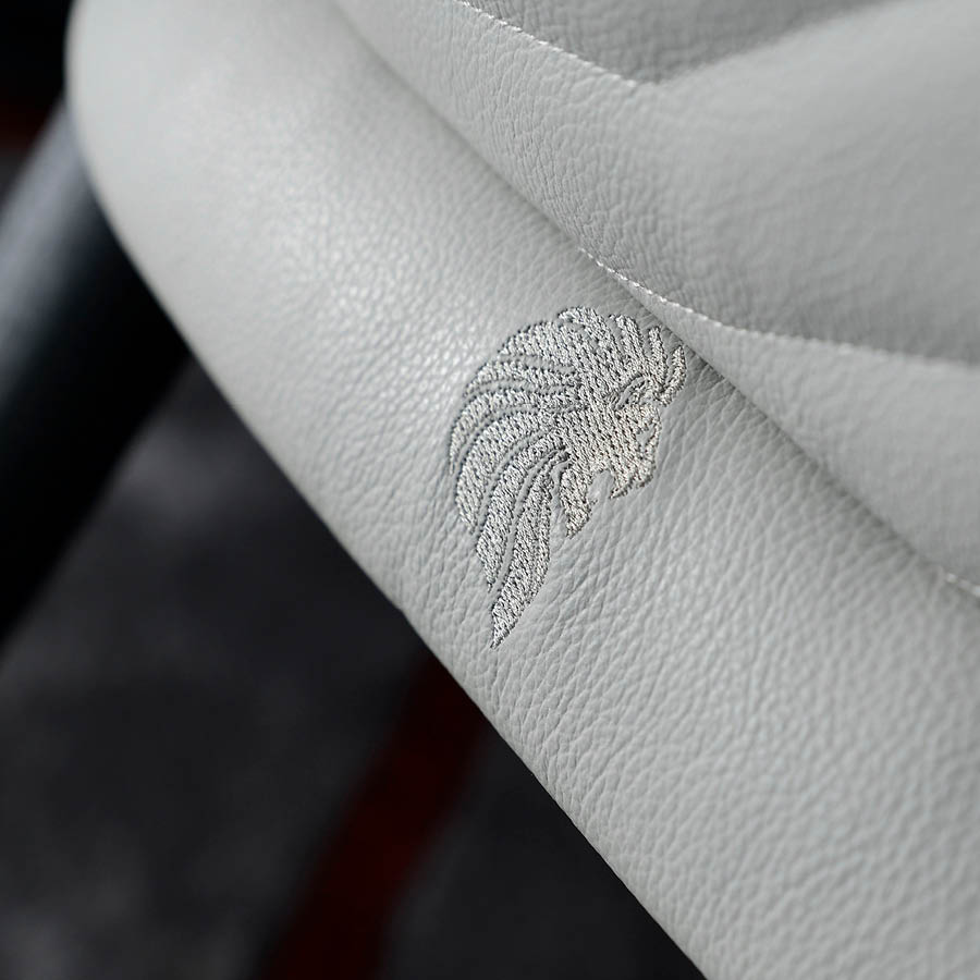 Fully upholstered armchair in solid oak. Back in quilted first grade leather, nubuk leather, lizard printed leather, velvet or suede fabric. Upholstered base with embroidered Giorgio Collection logo. 4 legs in satin open grain oak.
