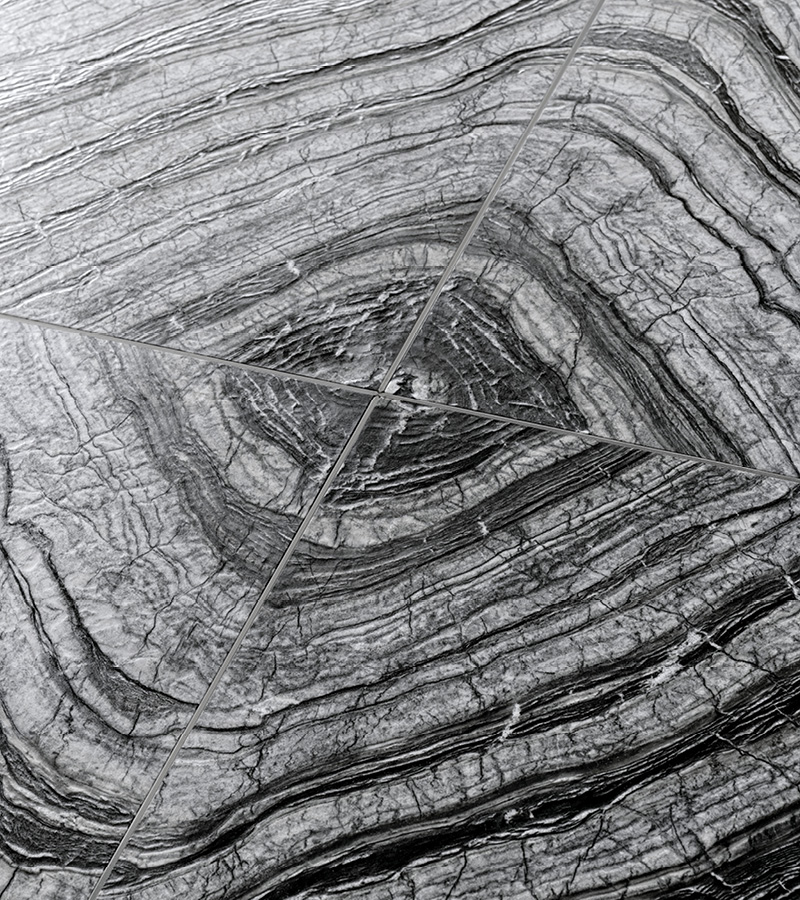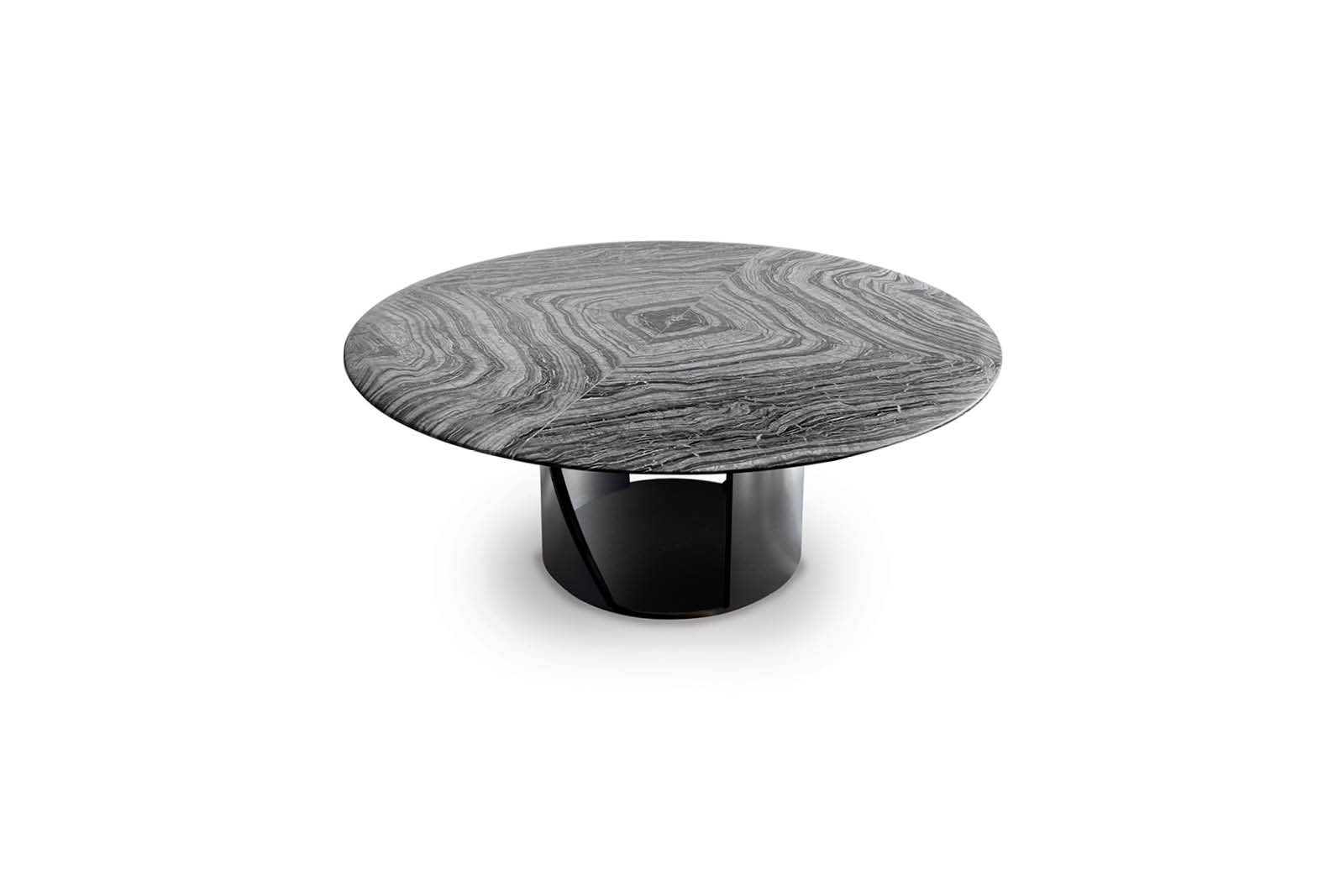 Black Kenya Marble Top Round Table. Base details in satin black nickel stainless steel with lasered Giorgio Collection logo.