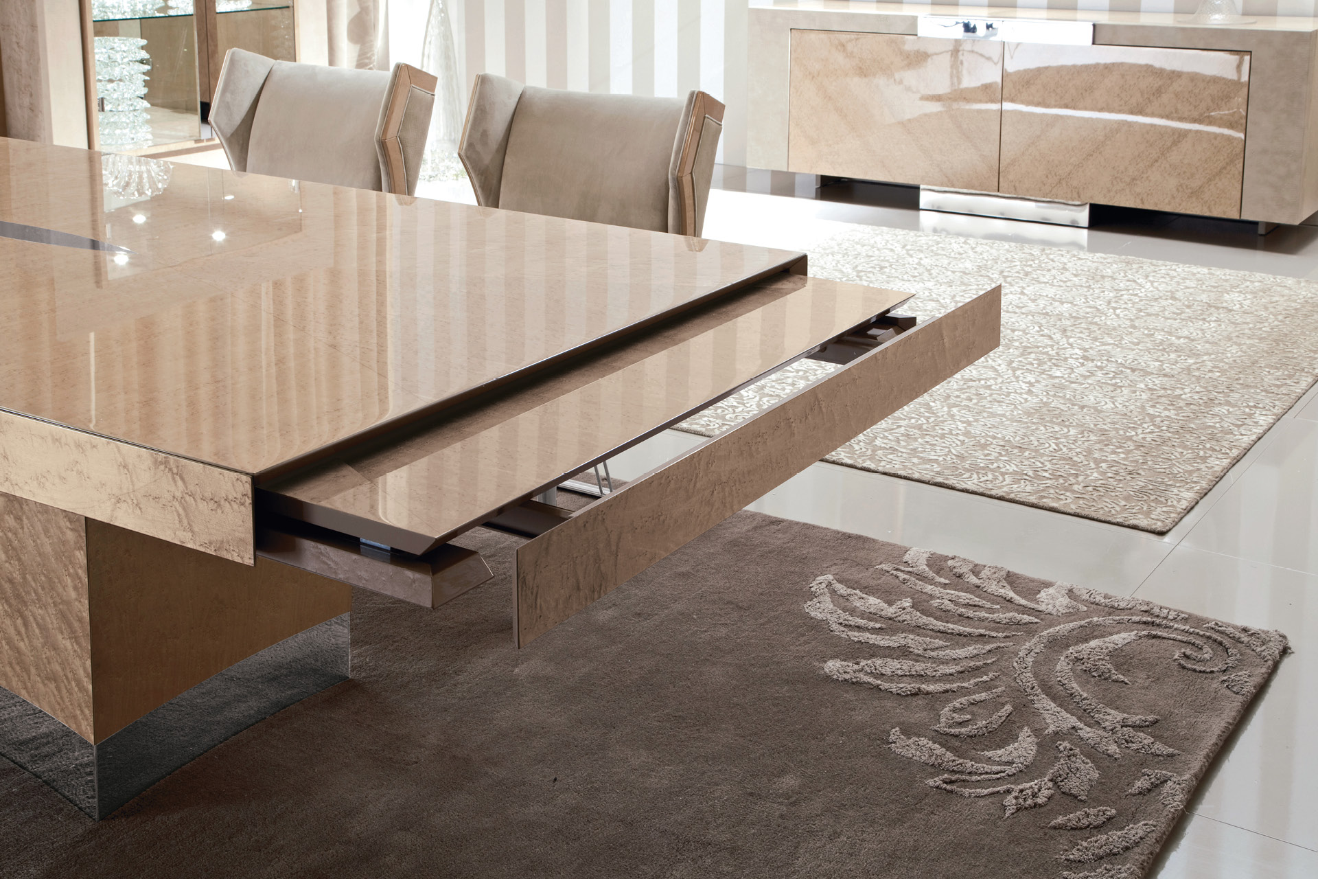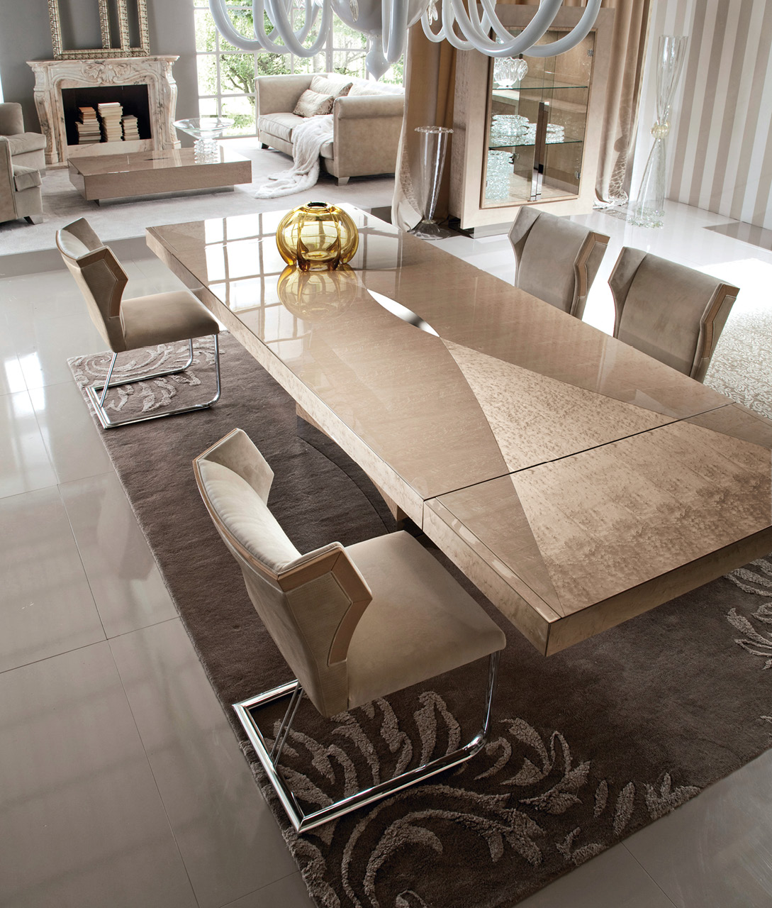 Rectangular table in champagne bird’s eye maple veneer with high gloss polyester finish. Base in chrome stainless steel.