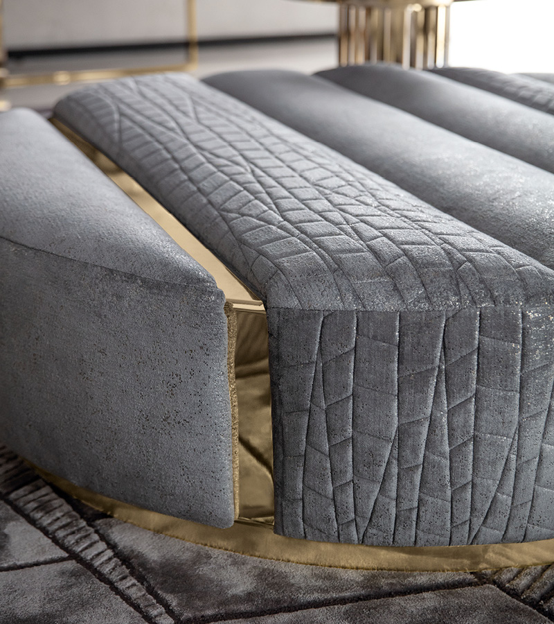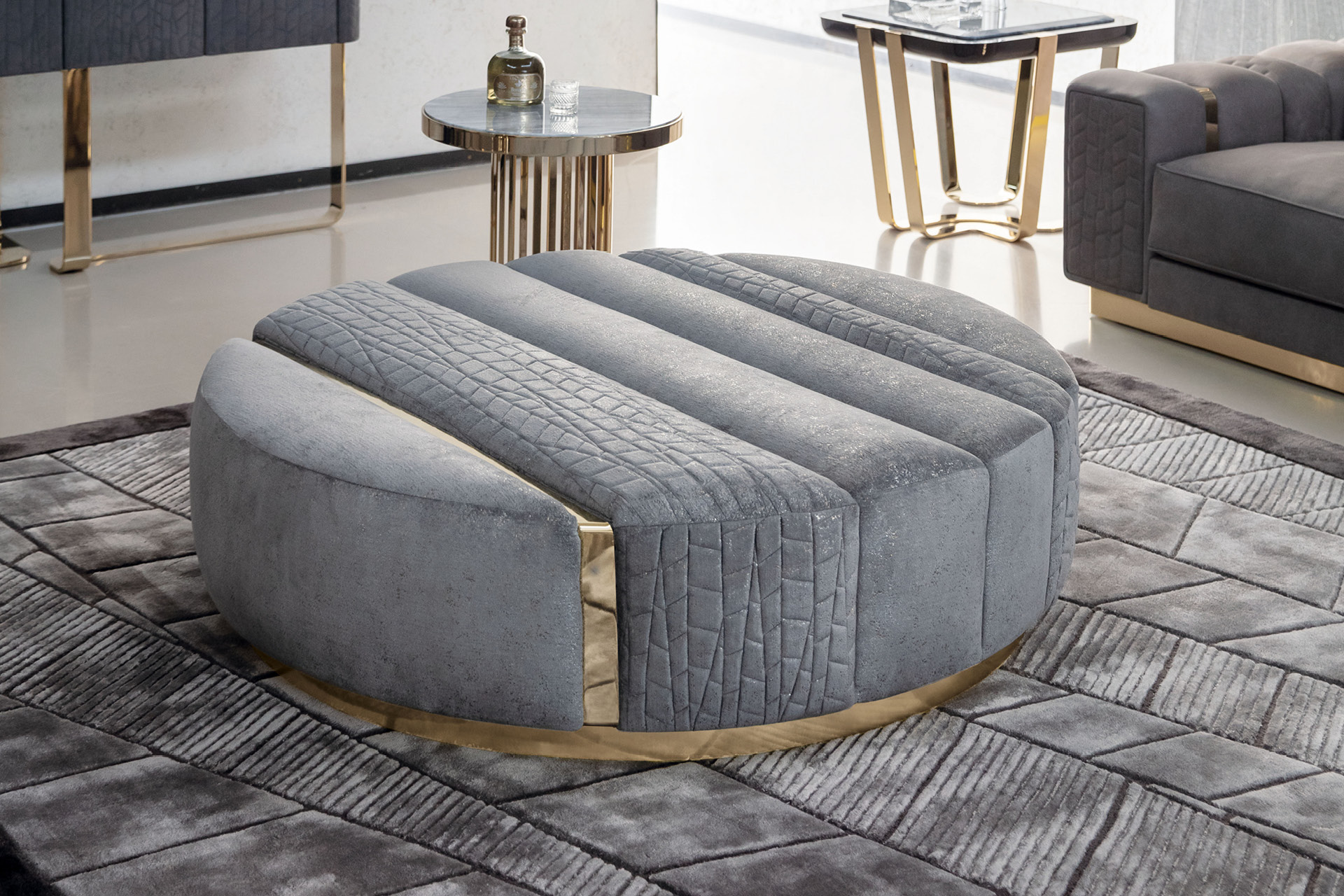 Round ottoman available in first grade leather, nubuk leather, lizard printed leather, velvet or suede fabric. Seat in special stitching in polyurethane foam wrapped in down feather. Center part realized in quilted finish. Base and metal trim in light gold chrome stainless steel with Giorgio Collection logo.