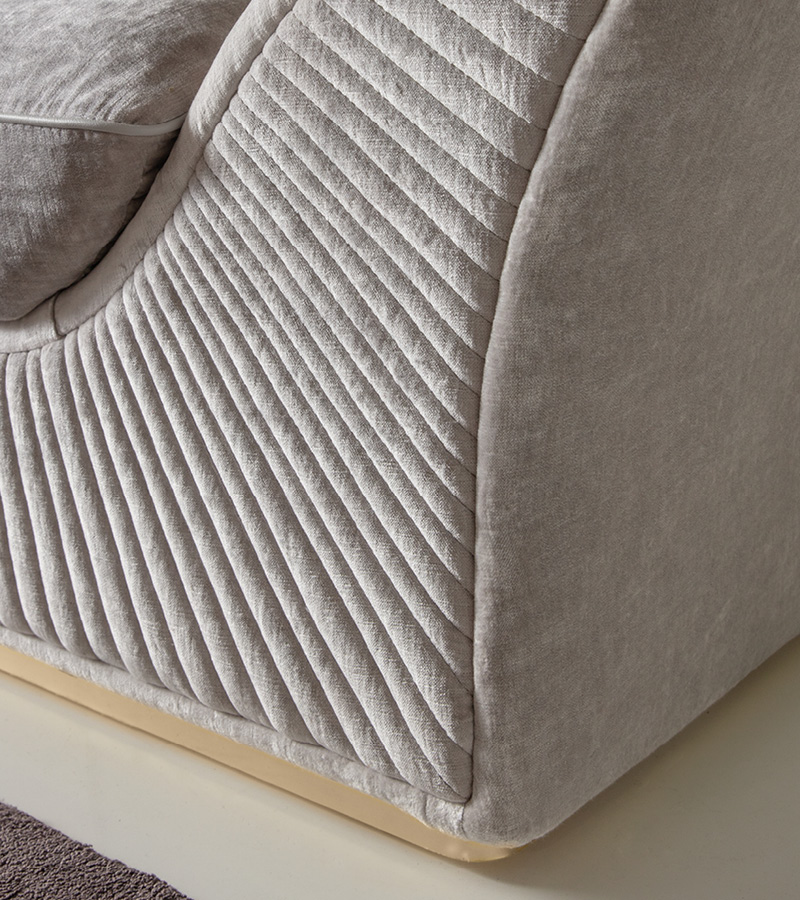Sofa armchair with quilted fronts available in first grade leather, nubuk leather, lizard printed leather, velvet or suede fabric. Seat and sides in polyurethane foam wrapped in down feather. Pillow with leather trim. 1 big back pillow and base + frontal insert in light gold chrome stainless steel with Giorgio Collection logo.