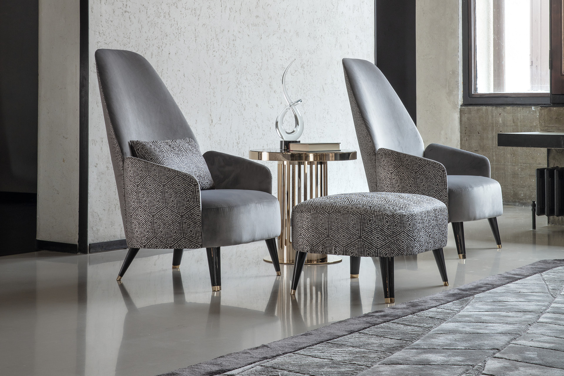 Occasional chair. Back with Giorgio Collection logo.Base details in light gold chrome stainless steel.