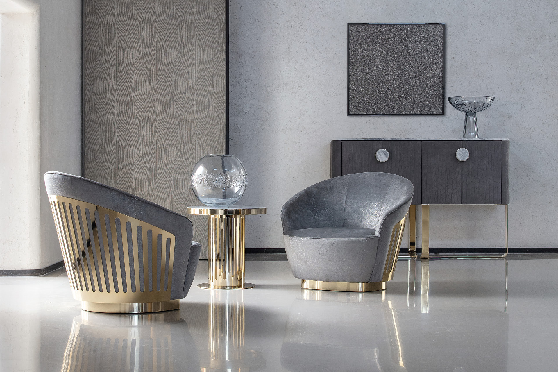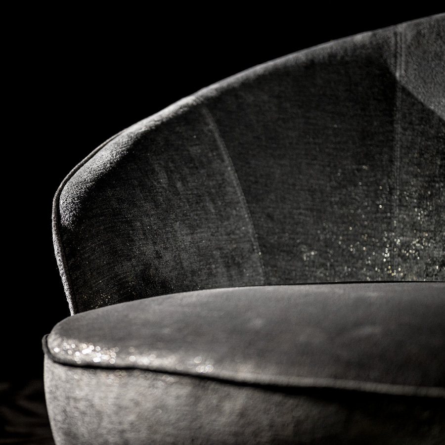 Occasional swivel chair. Back in light gold chrome stainless steel with Giorgio Collection logo.