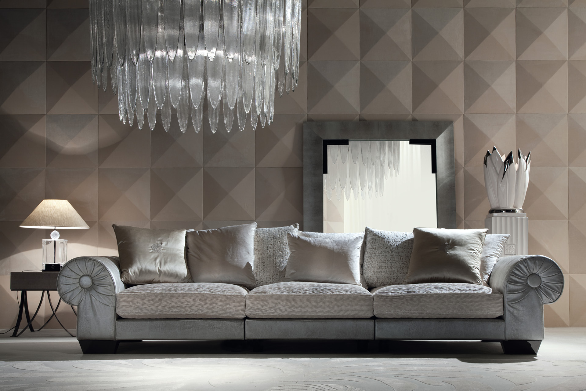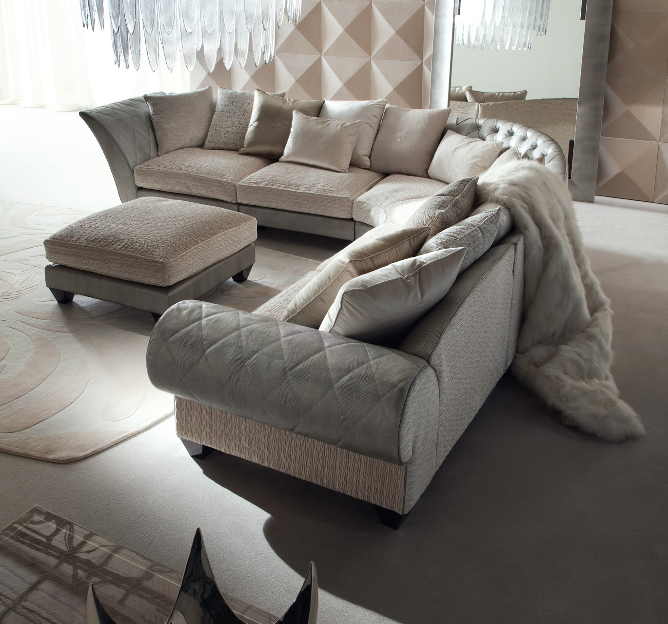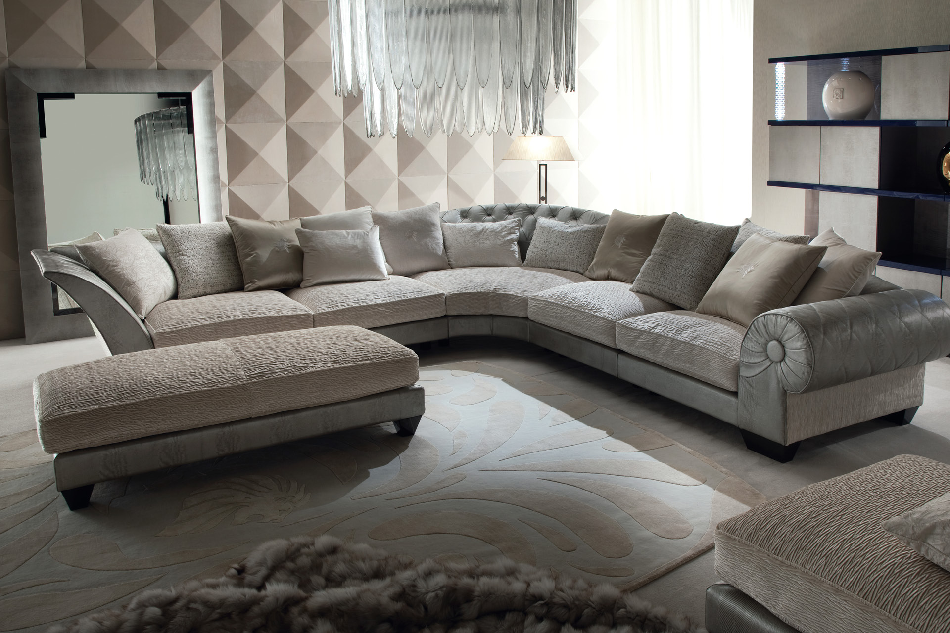 Yoko sectional sofa available in first grade leather, nubuk leather, lizard printed leather, velvet or suede fabric. Seat in polyurethane foam wrapped in down feather. Feet in stainless steel in storm dark grey finish.