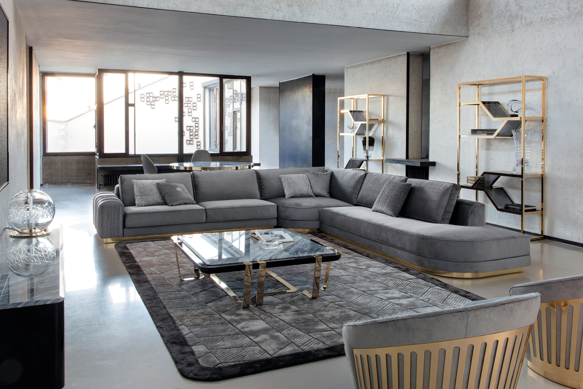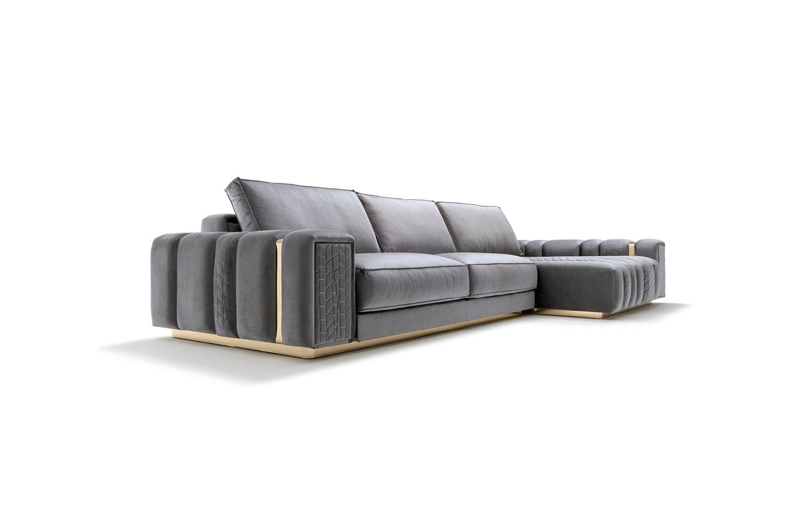 Charisma sectional sofa available in first grade leather, nubuk leather, lizard printed leather, velvet or suede fabric. Sofa seats and sides with double stitching in polyurethane foam wrapped in down feather. Base in light gold chrome stainless steel.