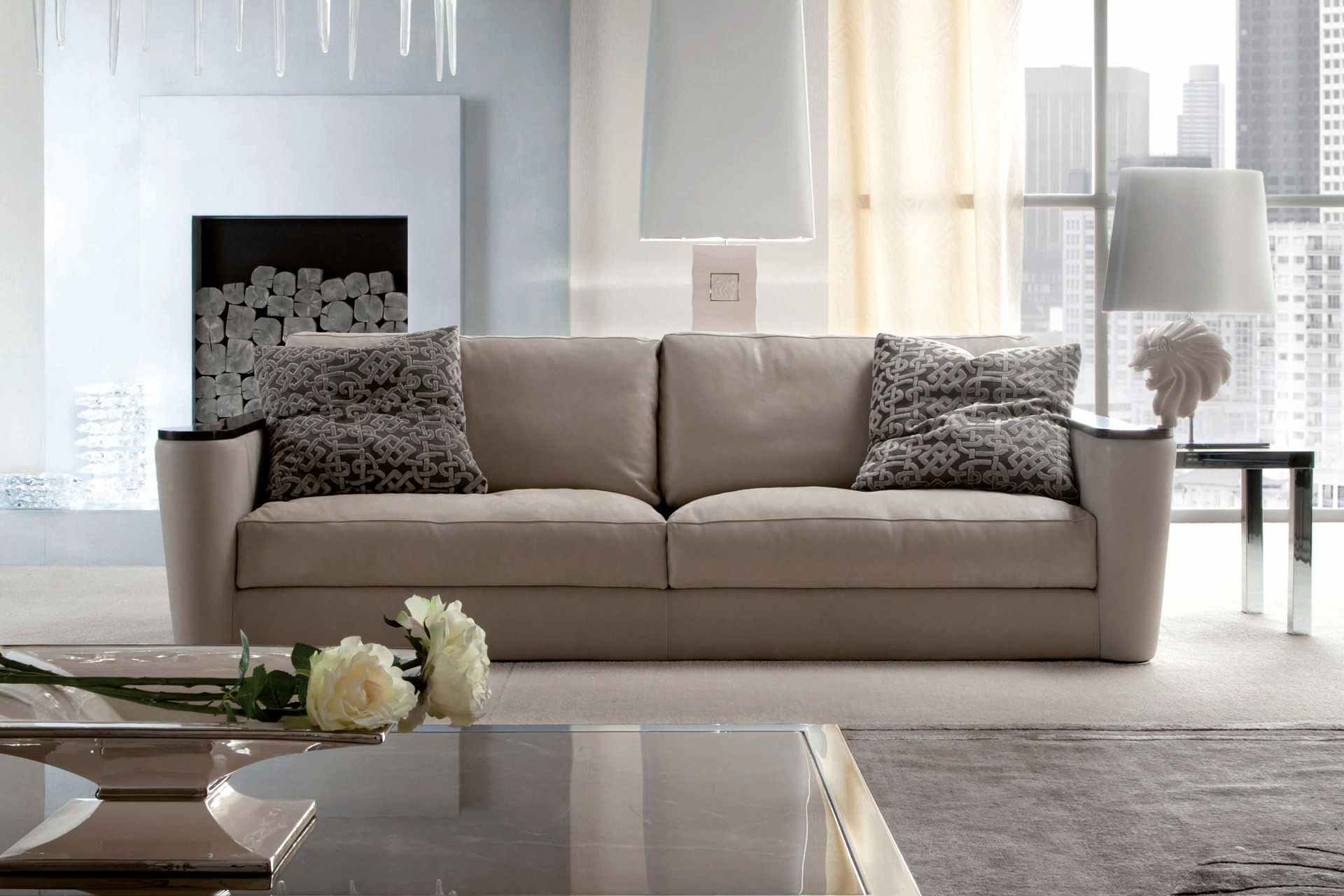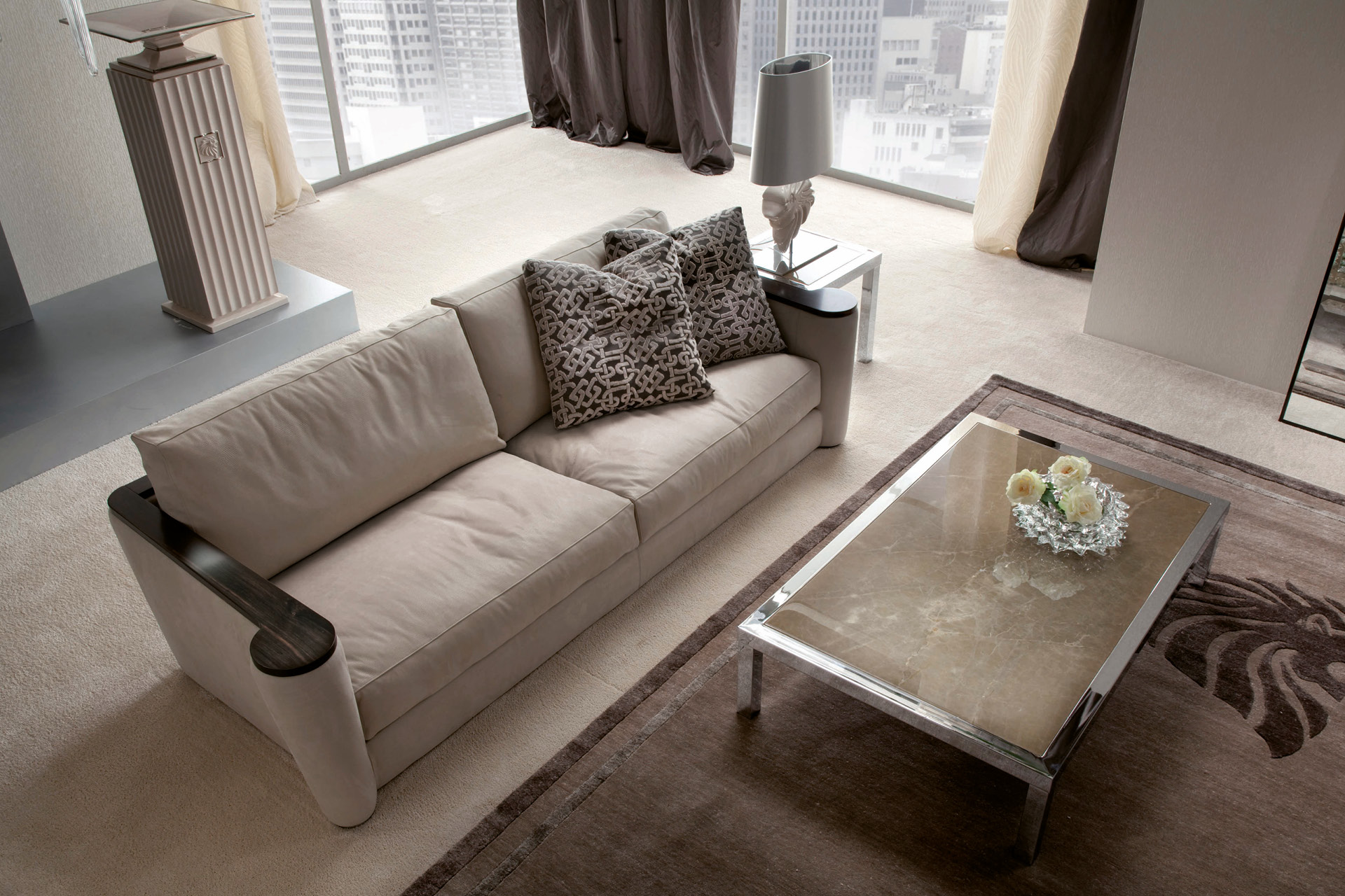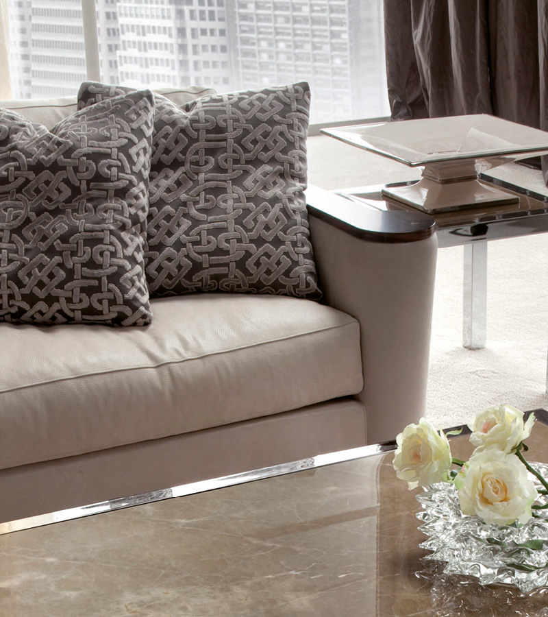 Fixed sofa with tops’ frames in makassar ebony veneer in satin finish. n. 2 seats in polyurethane foam wrapped in down. n. 2 throw pillow in fabric. Chrome stainless steel feet.