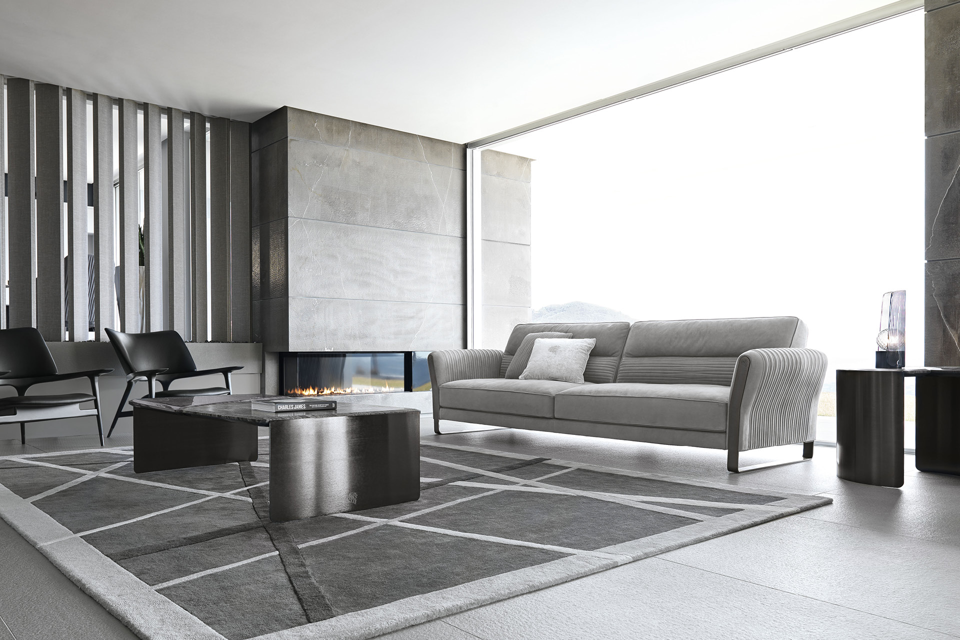Sofa available in first grade leather, nubuk leather, lizard printed leather, velvet or suede fabric. Sofa seats and sides with special stitching in polyurethane foam wrapped in down feather. High armrests. Legs and metal trims on the armrests in satin black nickel stainless steel with lasered Giorgio Collection logo.