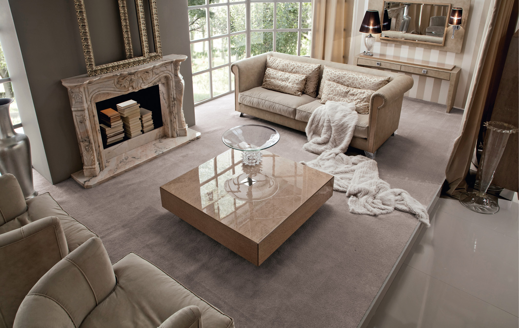 Fixed sofa with n. 2 big + 2 small pillows 2 side fronts in high gloss polyester bird’s eye maple veneer. Chrome stainless steel feet.