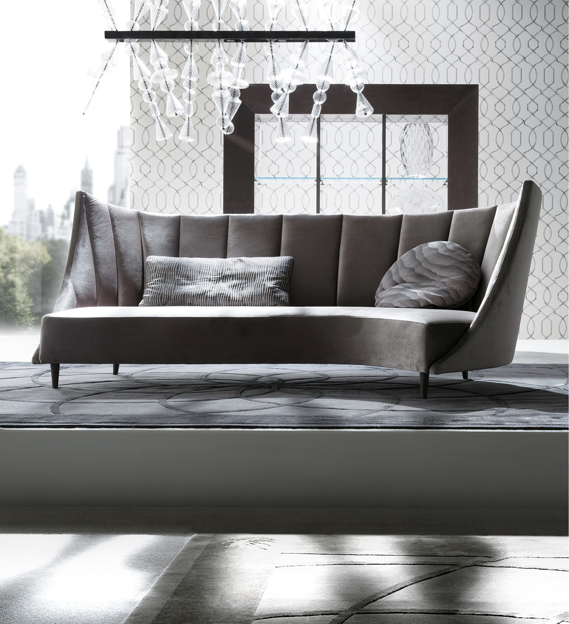Sofa 3 seats available in first grade leather, nubuk leather, lizard printed leather,velvet or suede fabric. Seat in polyurethane foam wrapped in down feather, 3 back pillows 100% down filling. Black nickel steel feet. Available left facing or right facing.