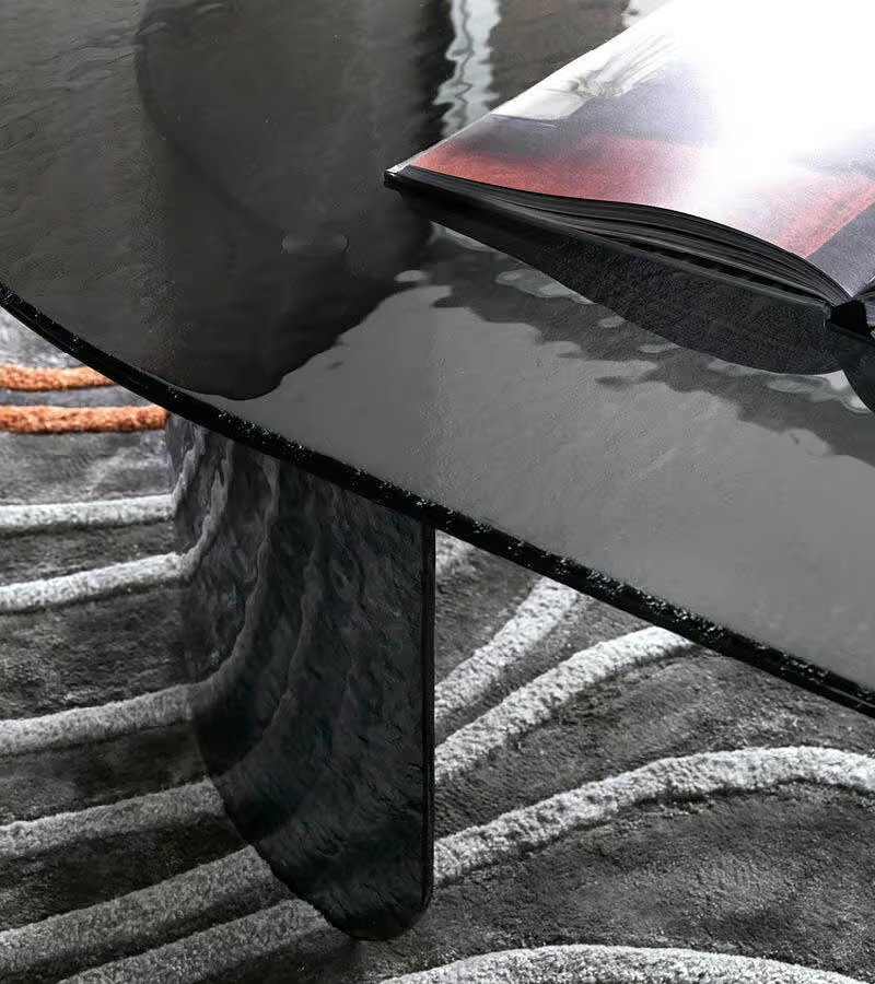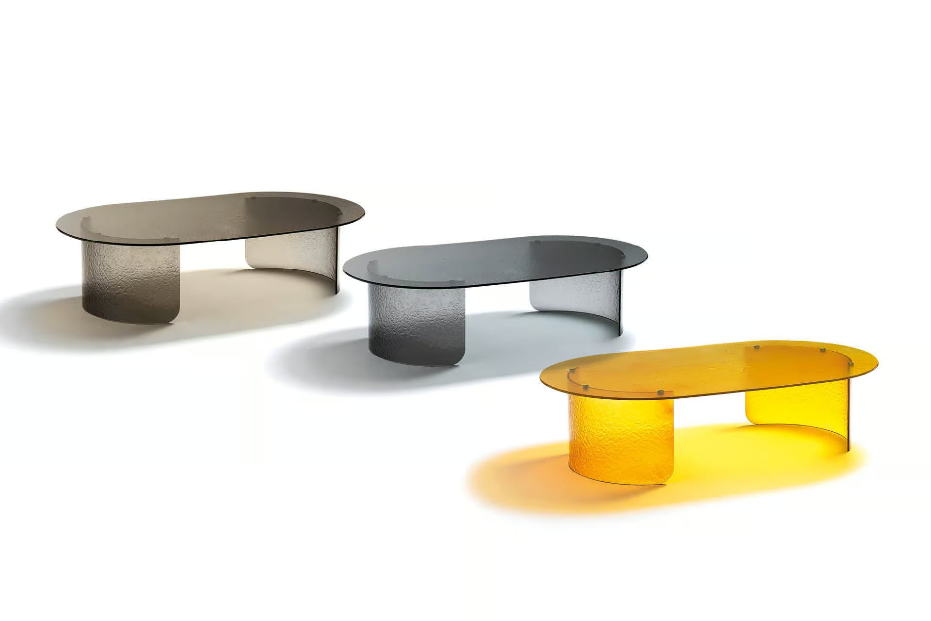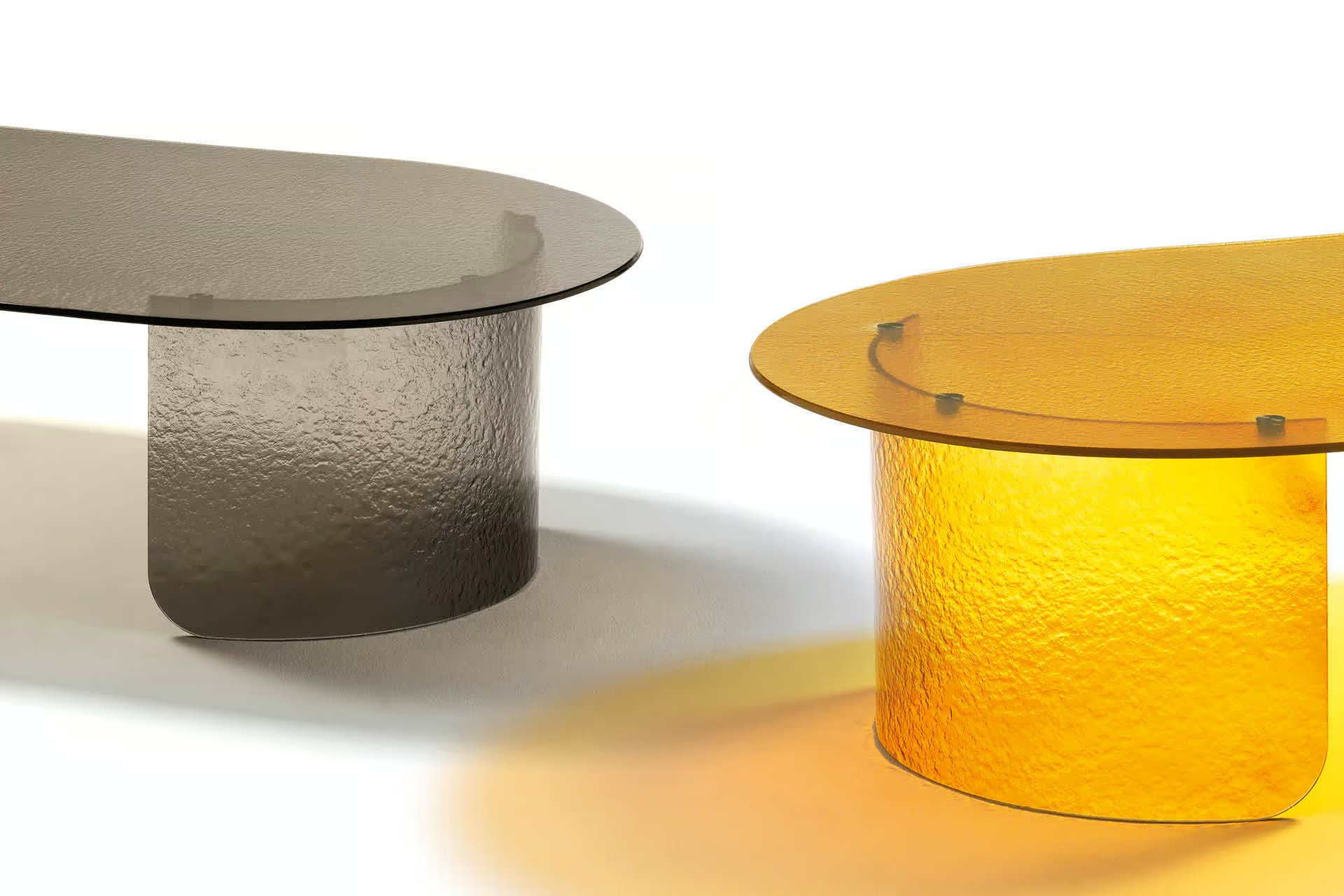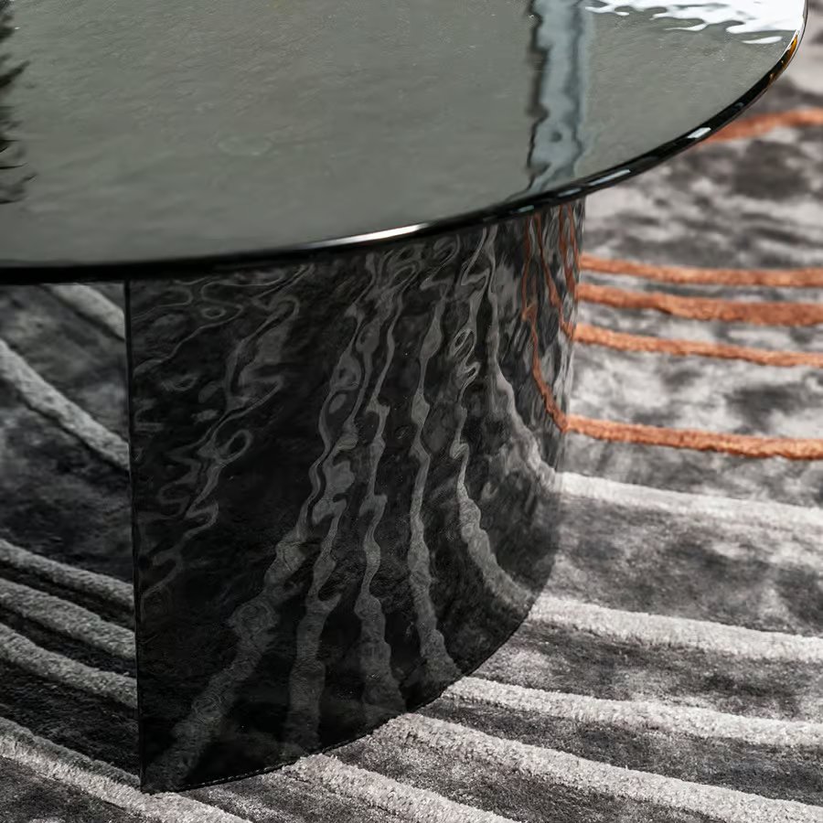 Oval cocktail table with top and base available in brown, smoke or amber hand hammered fused glass.