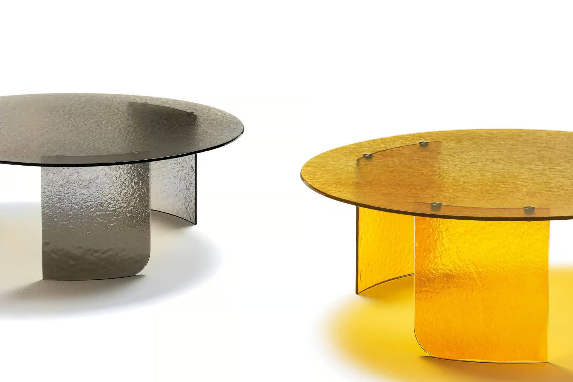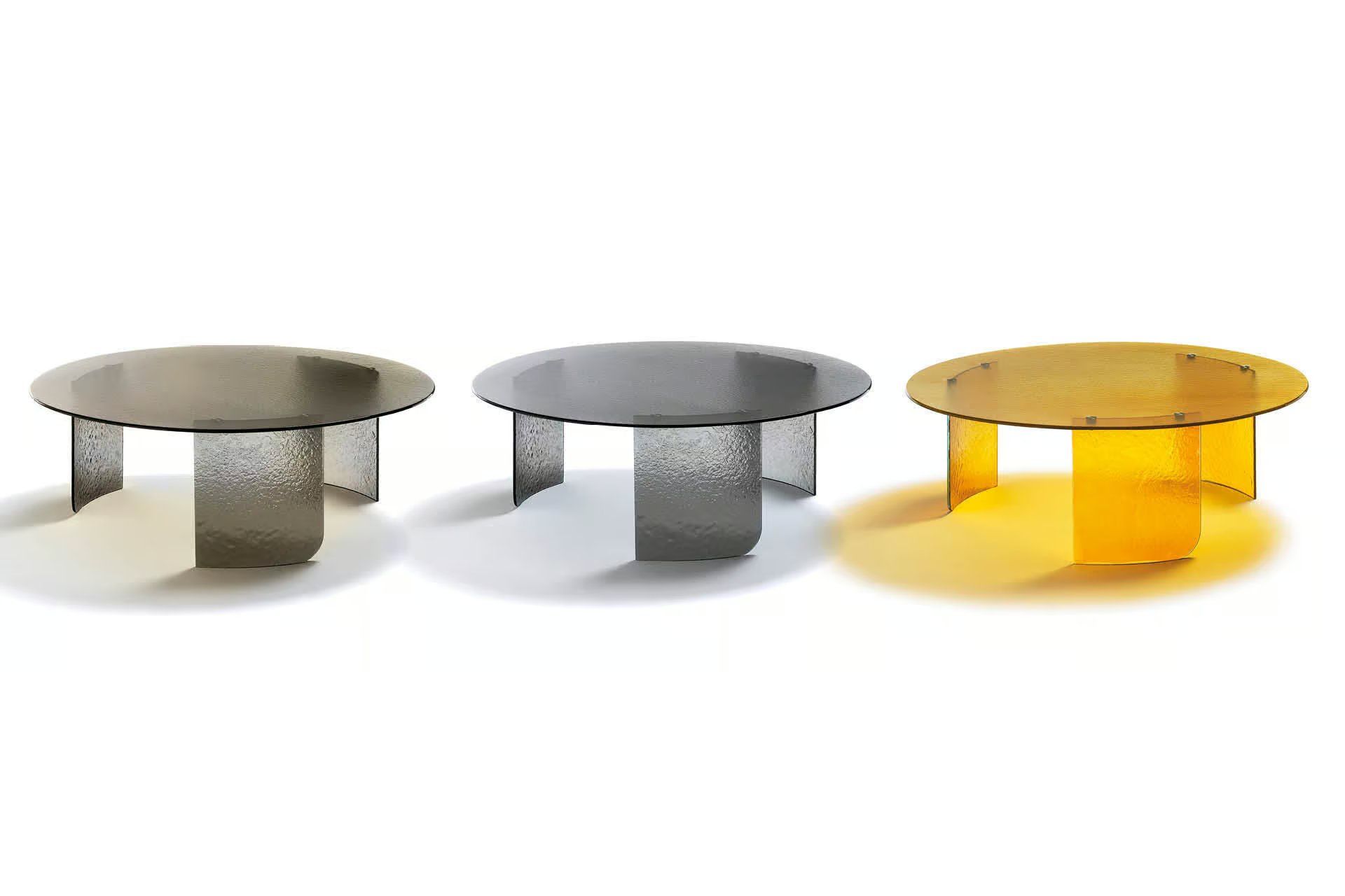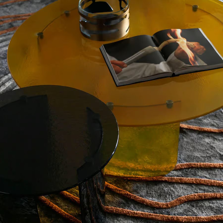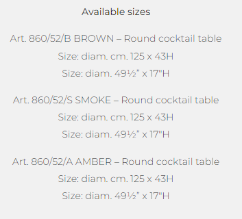 Round cocktail table with top and base available in brown, smoke or amber hand hammered fused glass.