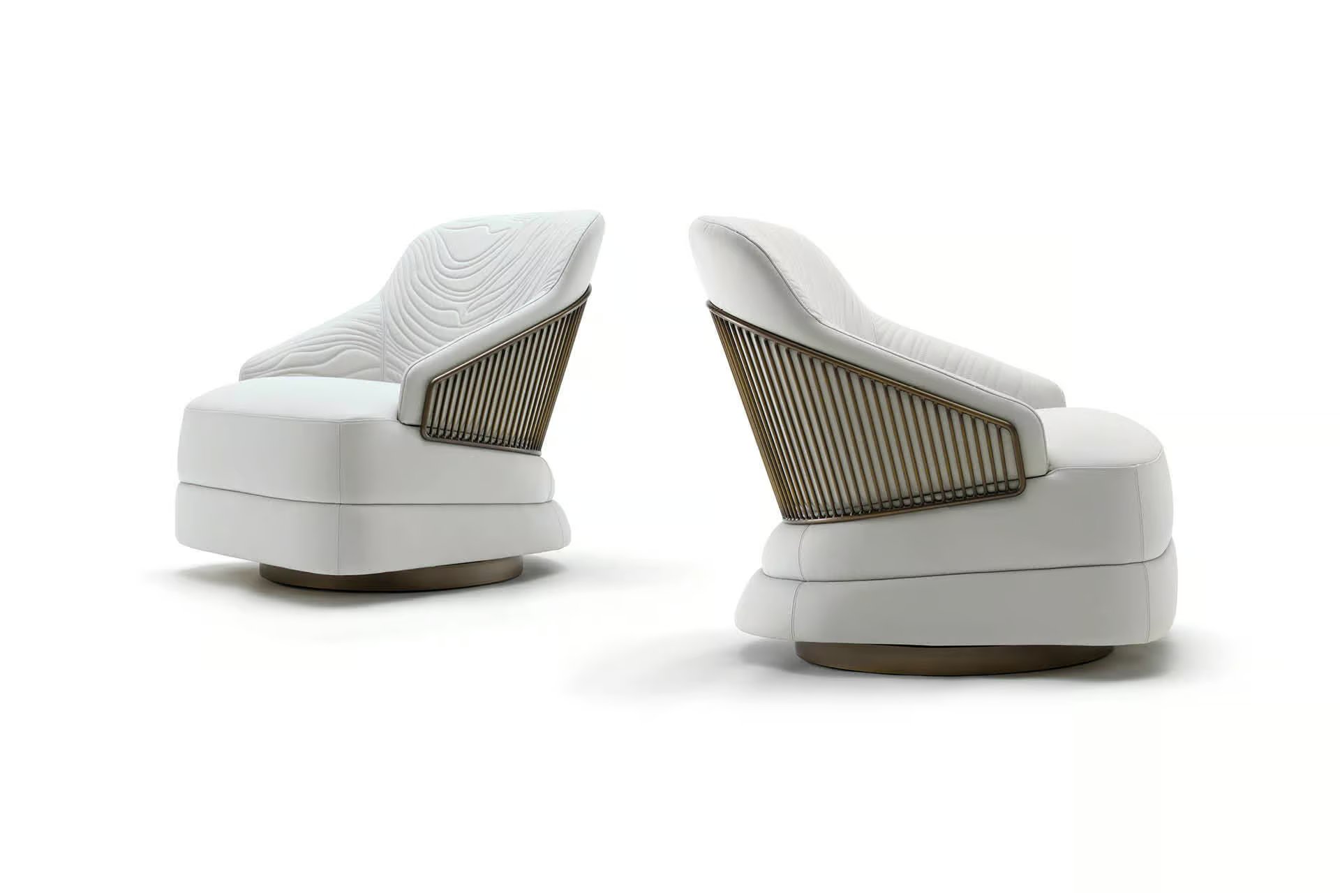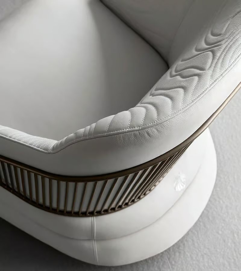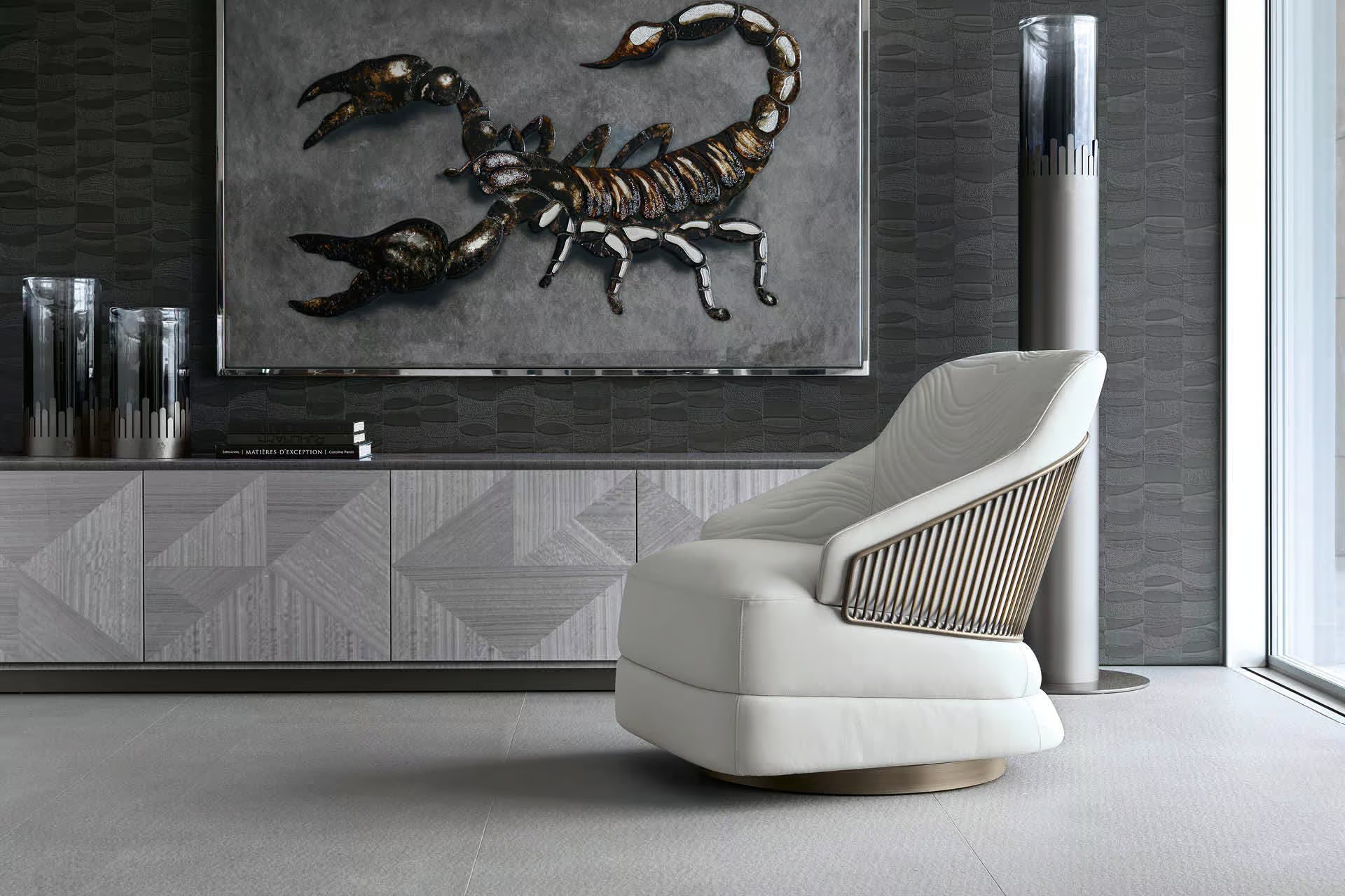 Occasional swivel chair available in first grade leather, nubuk leather, lizard printed leather, velvet or suede fabric. Chair seat and sides with double stitching in polyurethane foam wrapped in down feather. Quilted back with satined bronzed stainless steel structure. Seat height cm. 39.