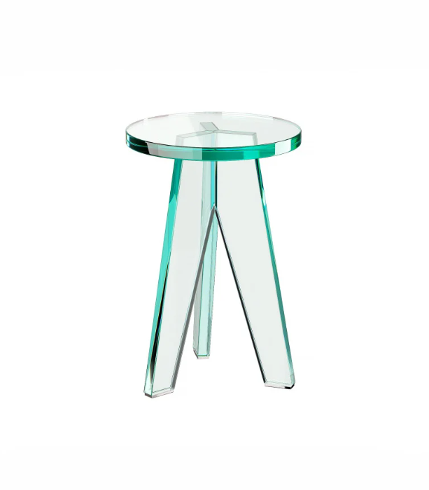 Sgabello-piccolo tavolino in cristallo trasparente mm 24 temperato, incollato a UV. Grazie a sofisticate e complesse lavorazioni è stato realizzato un oggetto completamente in cristallo, estremamente resistente ai carichi e dai dettagli magistralmente risolti. Dei discreti piedini in acciaio inox lucidato a specchio rifiniscono ed impreziosiscono l’oggetto.