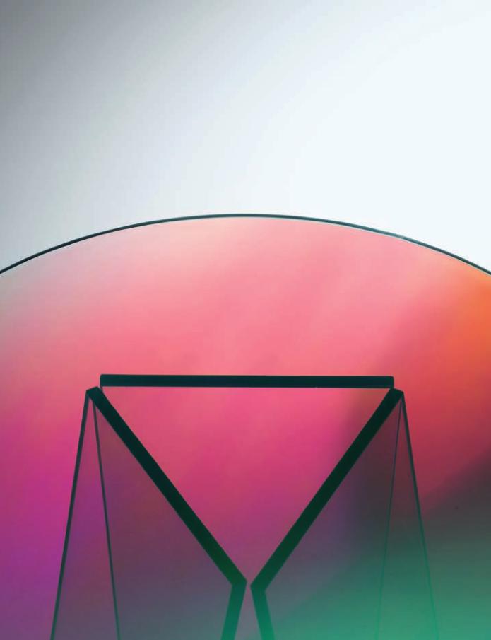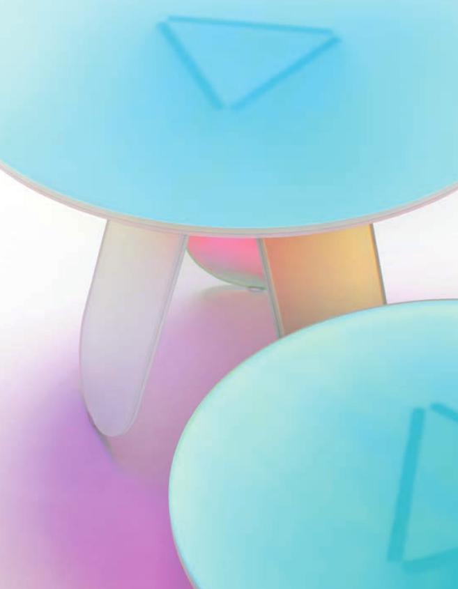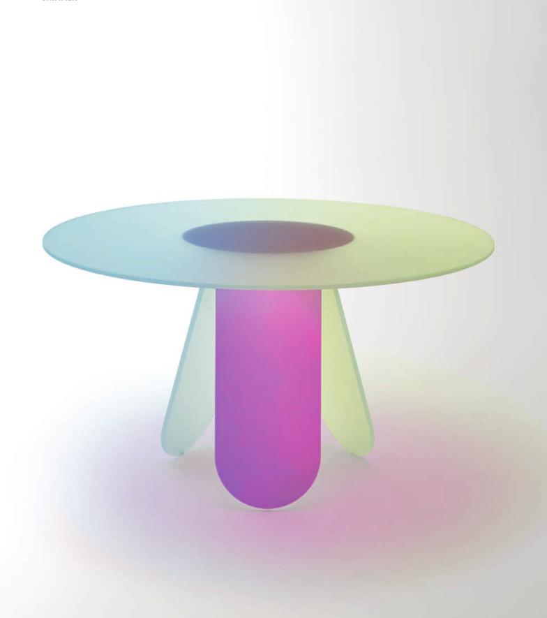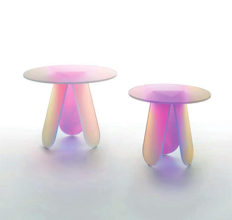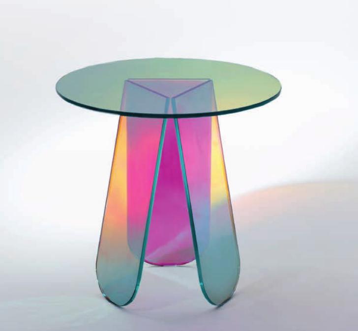Tavoli alti, bassi e consolle in cristallo stratificato e incollato, con una speciale finitura multicromatica cangiante, la cui colorazione varia in funzione dell’angolo di incidenza della luce e del punto di osservazione. Ne risultano oggetti dall’aspetto magico ed etereo. Nei tavoli alti le basi sono smontabili e vengono fissate ai piani tramite piastre metalliche, dissimulate da decori circolari con finitura coprente.
