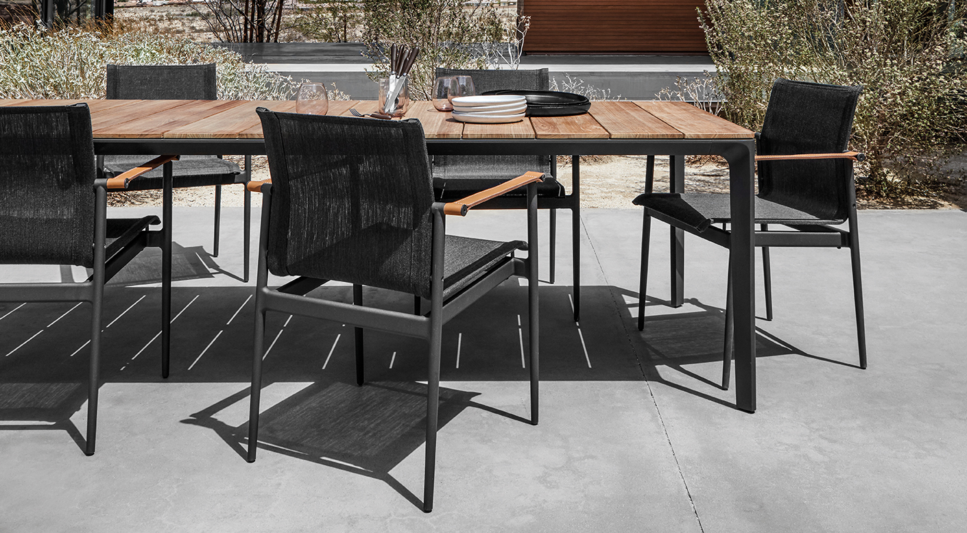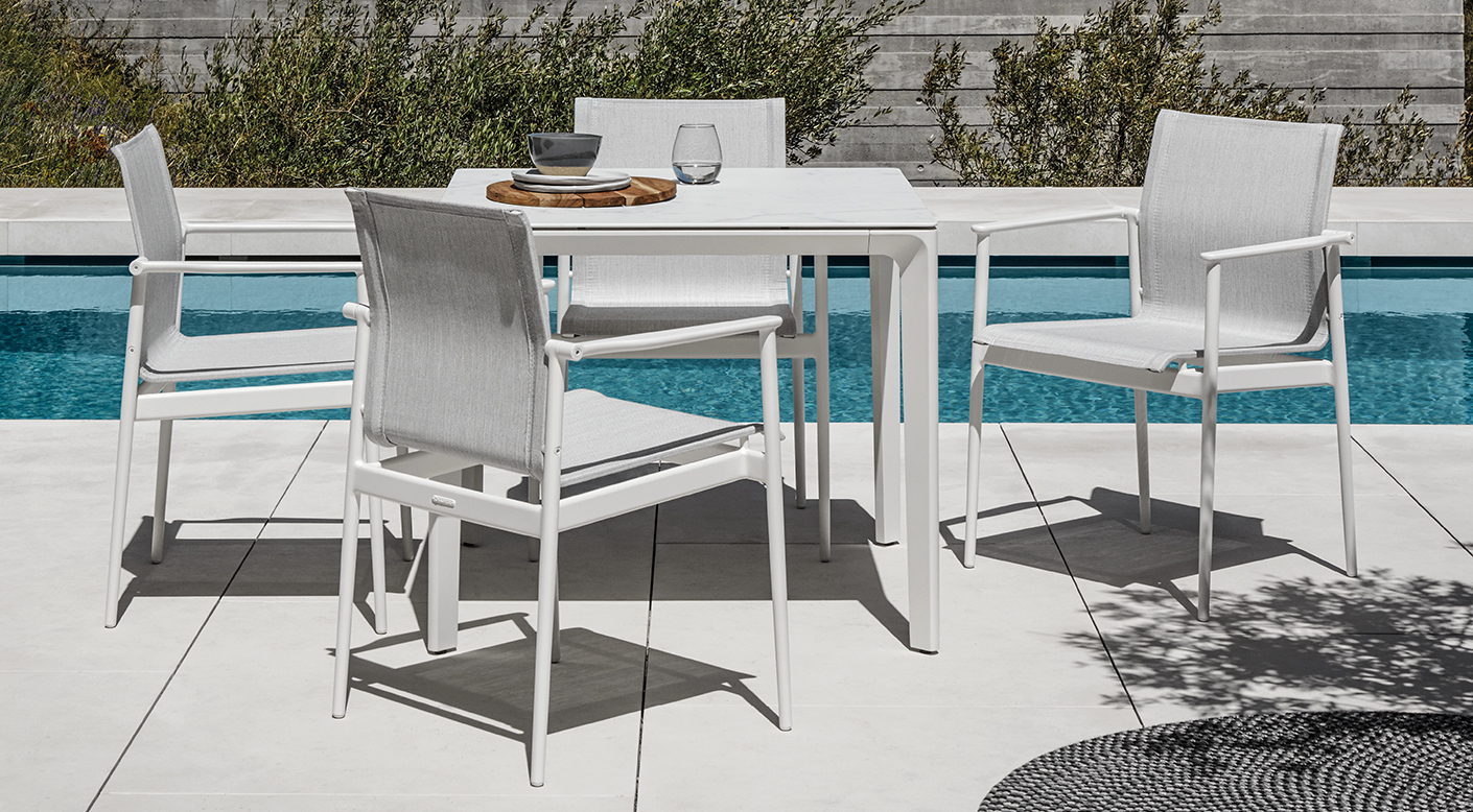 Starting with a simple chair, 180's no-nonsense lines are a functional favourite. With design cues emulating traditional wooden furniture but using a resilient combination of powder coated aluminium frames and weatherproof sling seats, practicality is always at the forefront in this collection of stacking outdoor furniture.