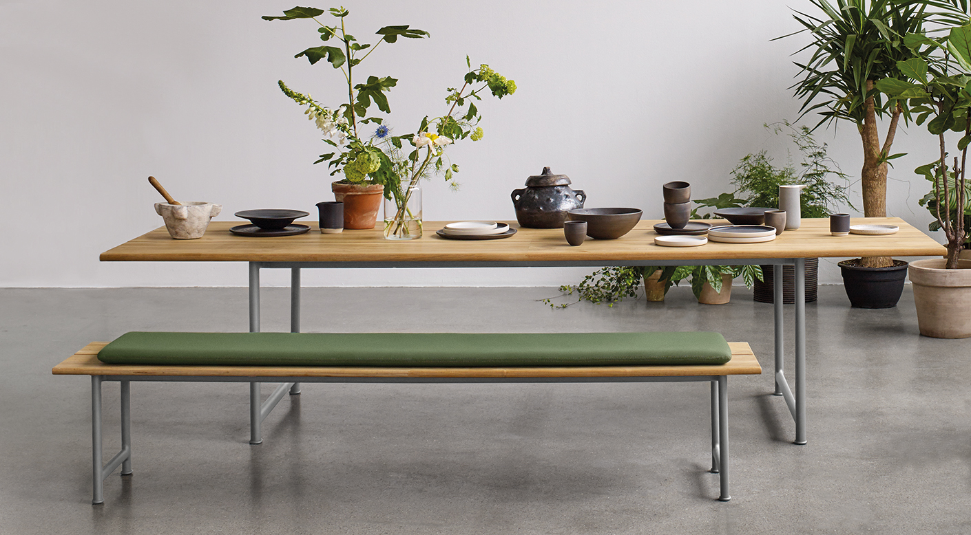 Atmosphere by Danish designer Cecilie Manz is inspired by observing relaxed social interaction. Minimal, powder coated aluminium frames, generous boards of sustainably harvested, plantation teak and cleverly designed, self-supporting upholstered panels covered with a selection of weather resistant outdoor fabrics combine to create intimate, indulgent seating.