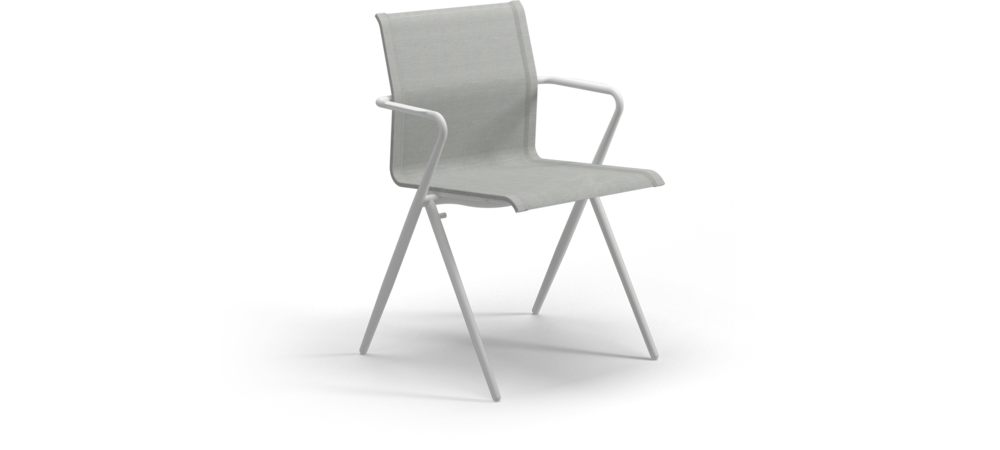 Perfectly poised, Ryder's slim, powder coated, stainless steel frame boasts a toughness belied by its fine lines. The converging lines of this stainless steel stacking frame are inspired by more traditional folding designs. But in a unique twist, removing the mechanism creates an unprecedented minimalism. Finely balanced on scissor like legs this architectural piece is purely aesthetics driven.