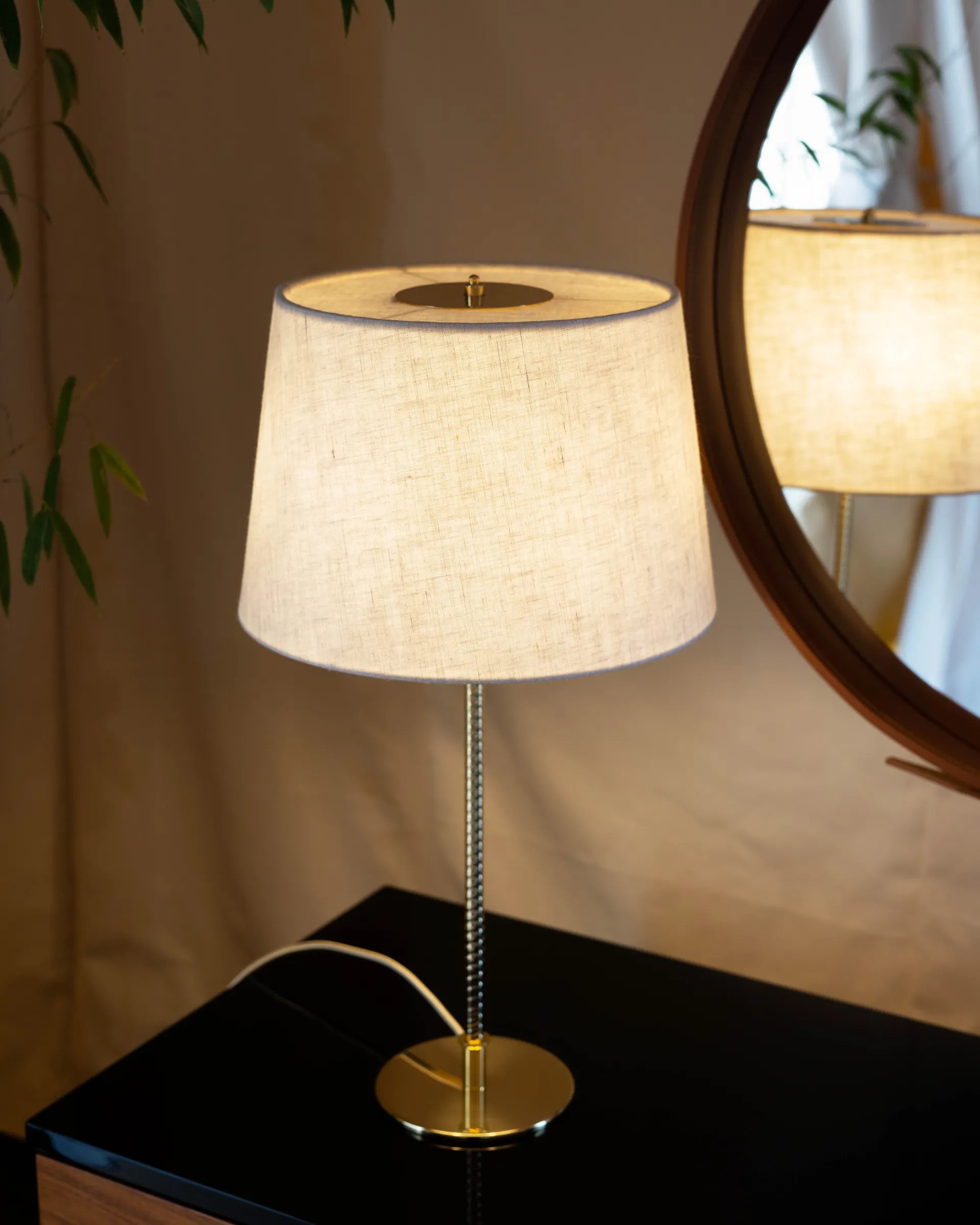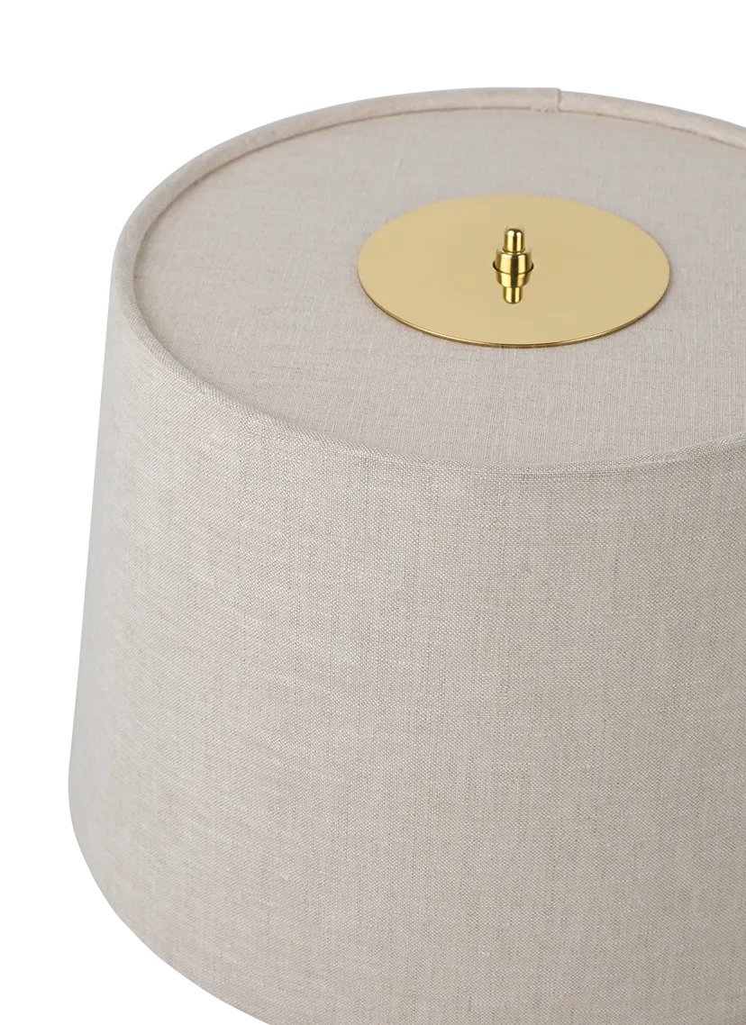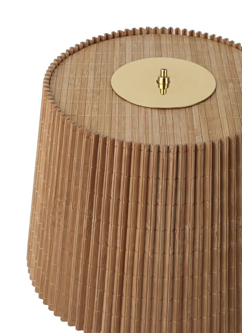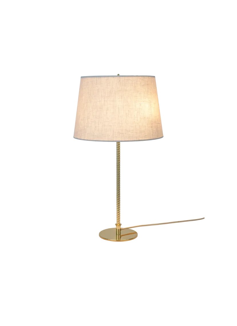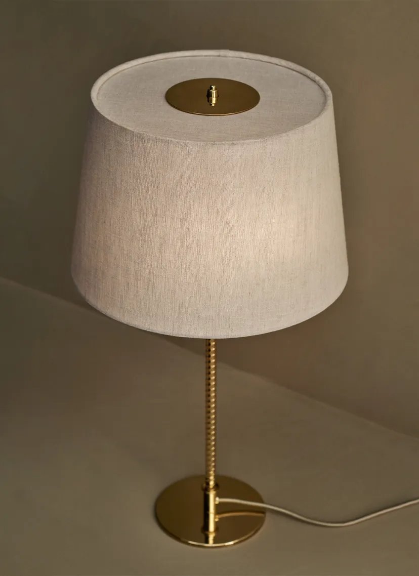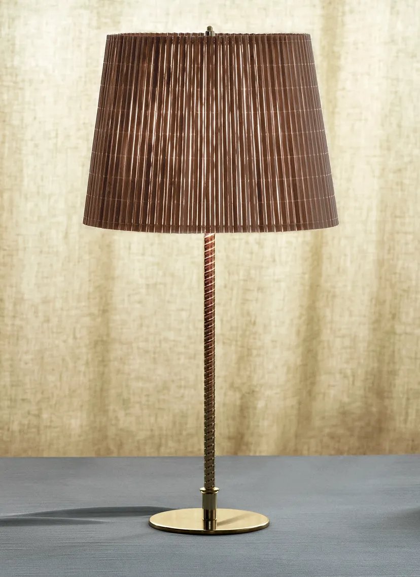 First produced around 1950, the 9205 is a classic, almost archetypal, table lamp with an unmistakable Tynell aesthetic. Elegant and slender, the lamp’s apparently simple form conceals an extraordinary degree of craftsmanship and highly skilled hand-making. The canvas model's shade is constructed by attaching the fabric to a liner, which is then manually fixed onto a wire frame, while the bamboo is made from a series of slats first sewn together by hand to form a pleated mat before being connected to the liner and frame a contemporary update to the ryegrass cane used in Taito’s original model. The stem is milled with a rattan-like pattern, created by a metalsmith using a lathe with great precision and attention to detail to mimic the effect of a series of overlapping strips. A brass plate, screwed into the stem, keeps the shade in place.
