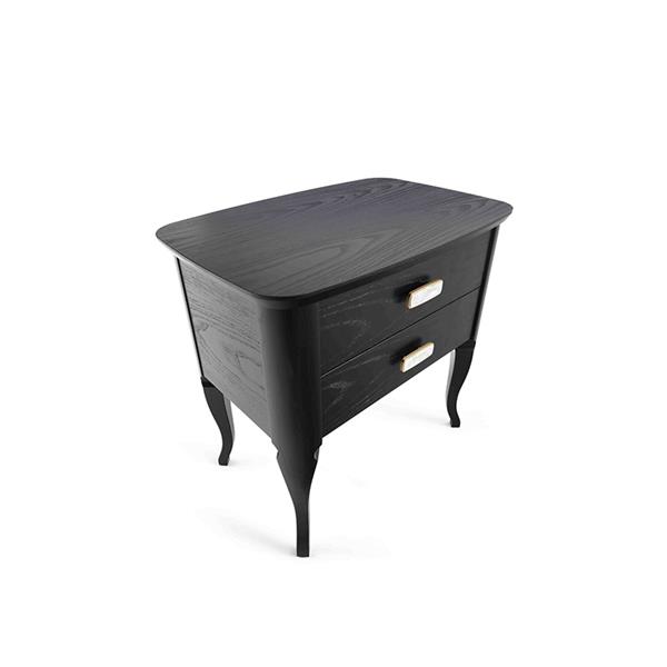 Night table with structure and drawers front in ash veneered wood and solid wood. Drawer runners with Blumotion technology. Brass Decò handles, with buffalo's horn inset.