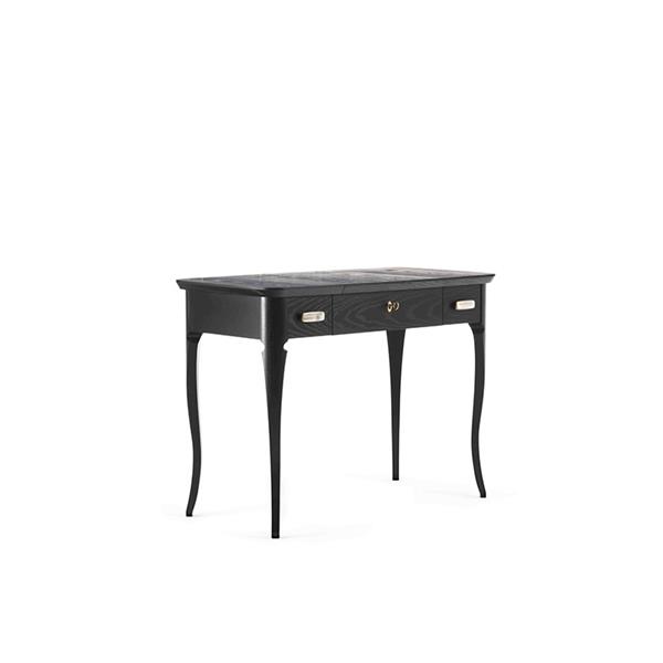 Vanity table with ash wood veneered top with shaped solid wood edge and pull-up mirror. Solid wood and ash wood veneered structure. Drawers runners with Blumotion technology. Brass Decò handles, with buffalo's horn inset.