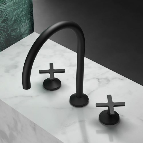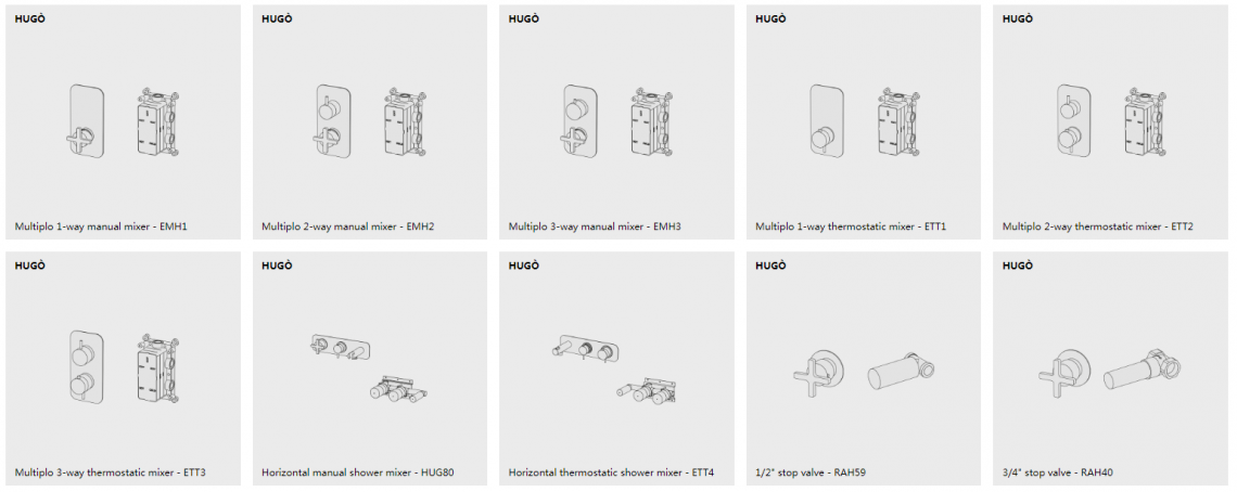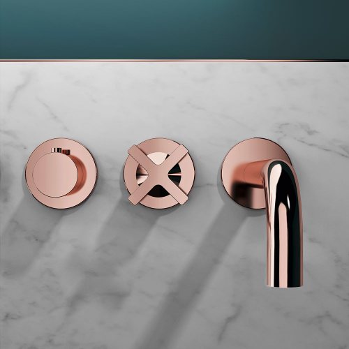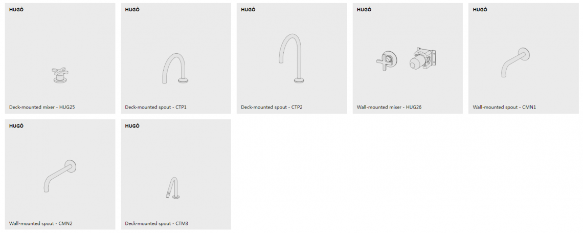 Hugò is a series of brass bathroom mixers. It is available in the mixer version, both single-hole and two-hole, deck-mounted and wall-mounted tap, with two and three holes, and in the exclusive bath and shower kits (also in the high flow rate versions).