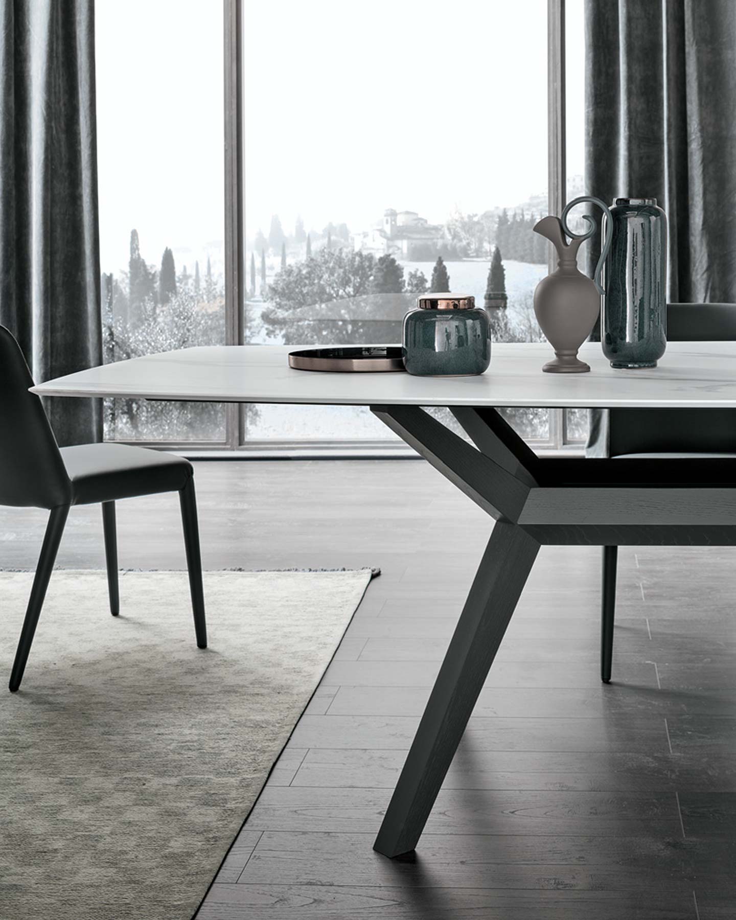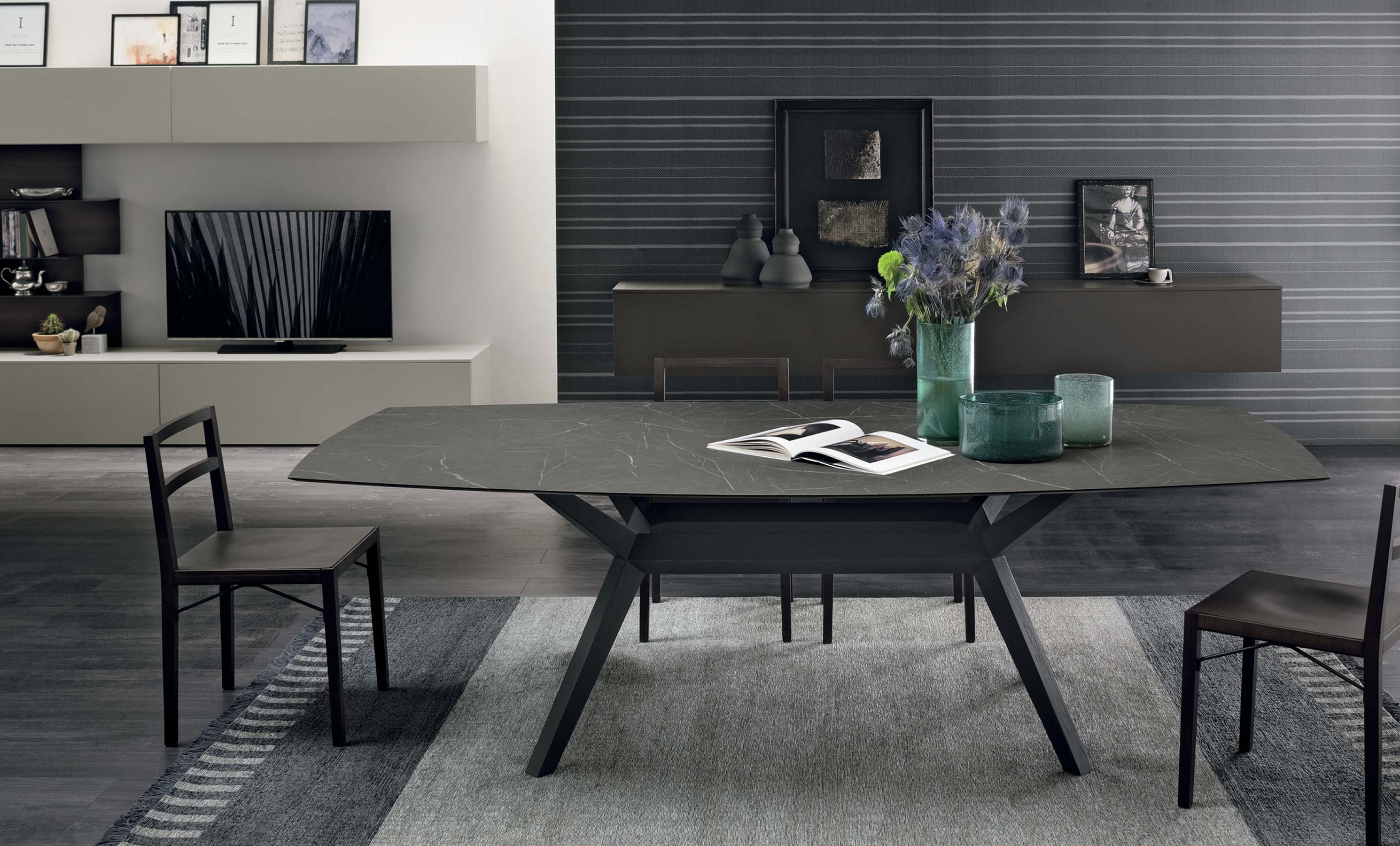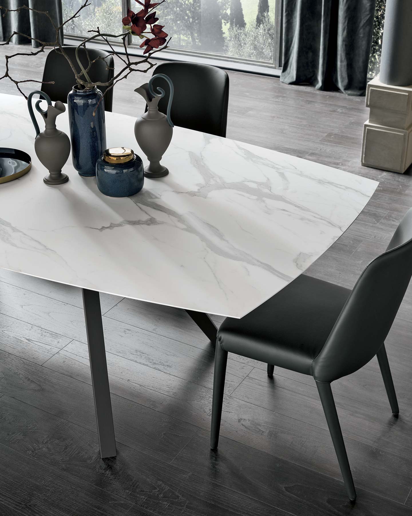 Finishes in the photo / The hpl top of the avalon table adds a new marble-effect texture to the dining room.
