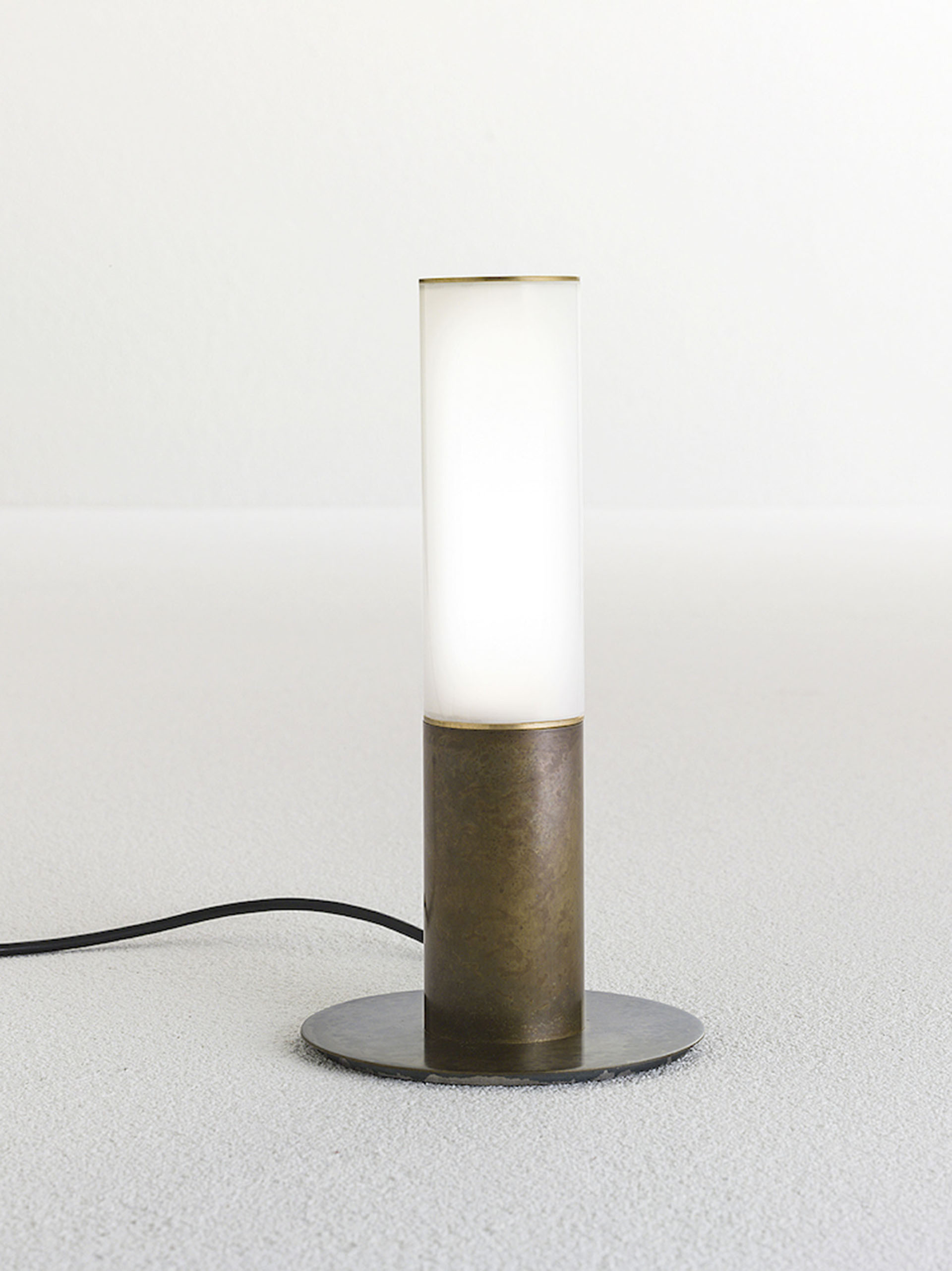 La collezione, disponibile con struttura in ottone naturale (ONB) o ottone anticato (OOB) e vetro borosilicato, è composta da sospensione, piantana, lampada tavolo e applique.