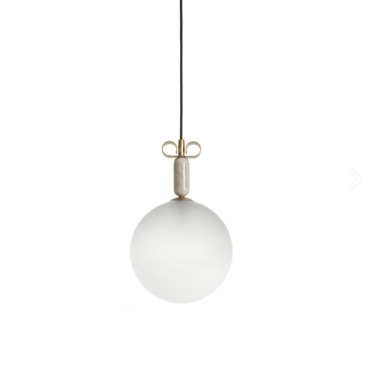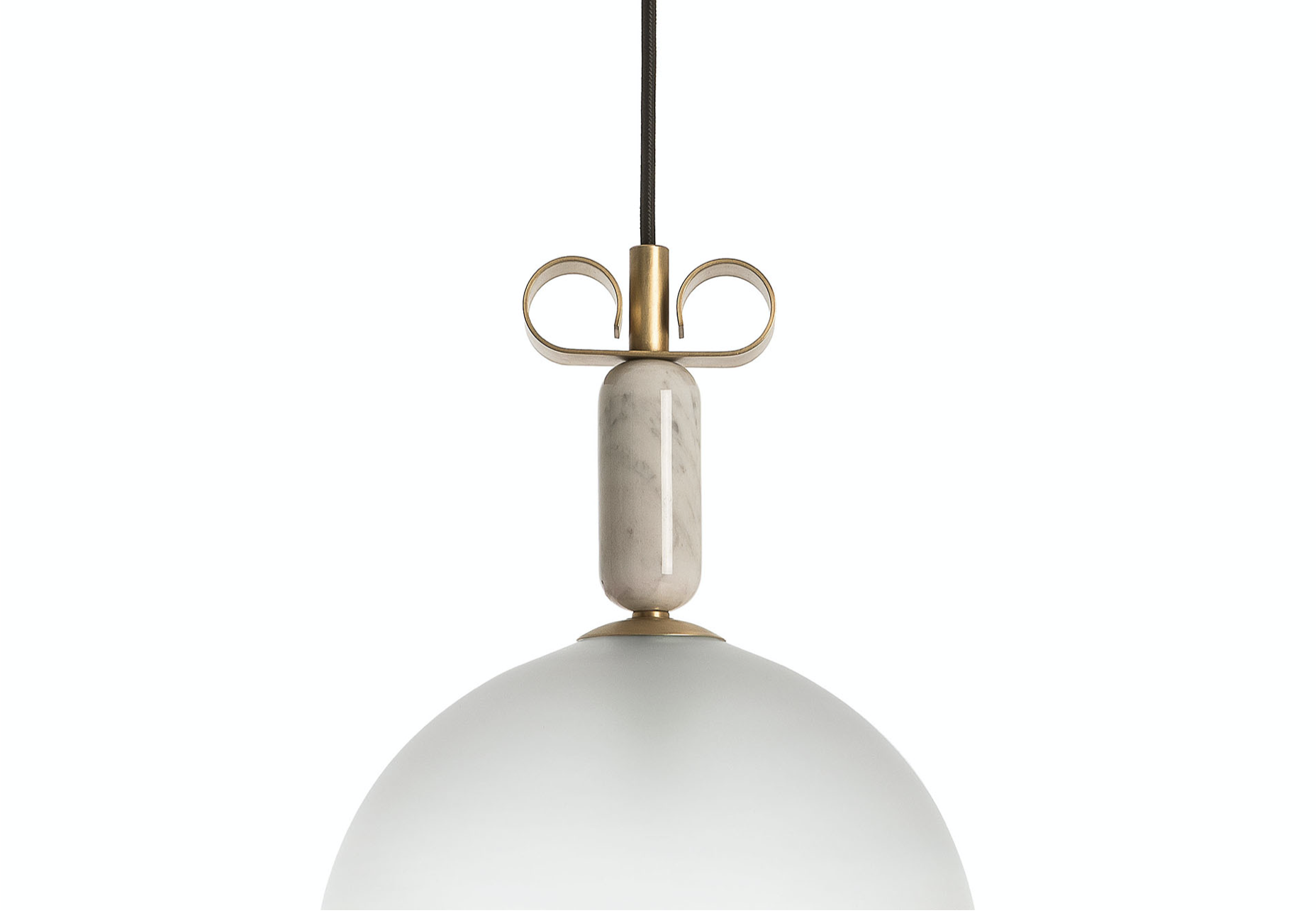 L’allure di Bon Ton si arricchisce di una versione “preziosa” in vetro e marmo, un abito da sera per le occasioni speciali che coniuga animo decò e leggerezza. La sfera di vetro sfumato è disponibile in grigio perla e rosa e l’elemento di marmo in bianco carrara o verde alpi. Il dettaglio del riccio in ottone, elemento emblematico della designer che riporta alla mente l’orecchino simbolo di eleganza e femminilità, è stato mantenuto nella sua versione originale. Un’opera di luce in cui elementi tipici dell’Italian style vengono reinterpretati con grazia in maniera contemporanea e iconica.