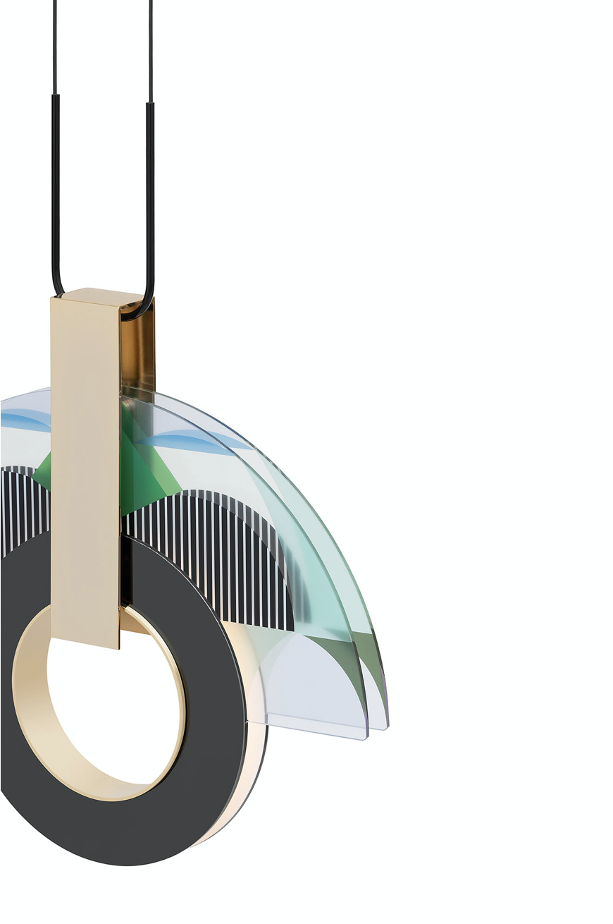 è una lampada a sospensione, sintetica nella sua essenza ma complessa nella sua struttura. La composizione genera inconsapevolmente quell’alito di opulenza caratteristico dell’art déco americana, richiamata anche dal nome della città che incarna quel movimento stilistico. MIAMI è il perfetto connubio tra elementi metallici e vetro decorato, che intrecciandosi fungono da anima e corpo delle lampade stesse, generando un perfetto equilibrio tra estetica e funzione.