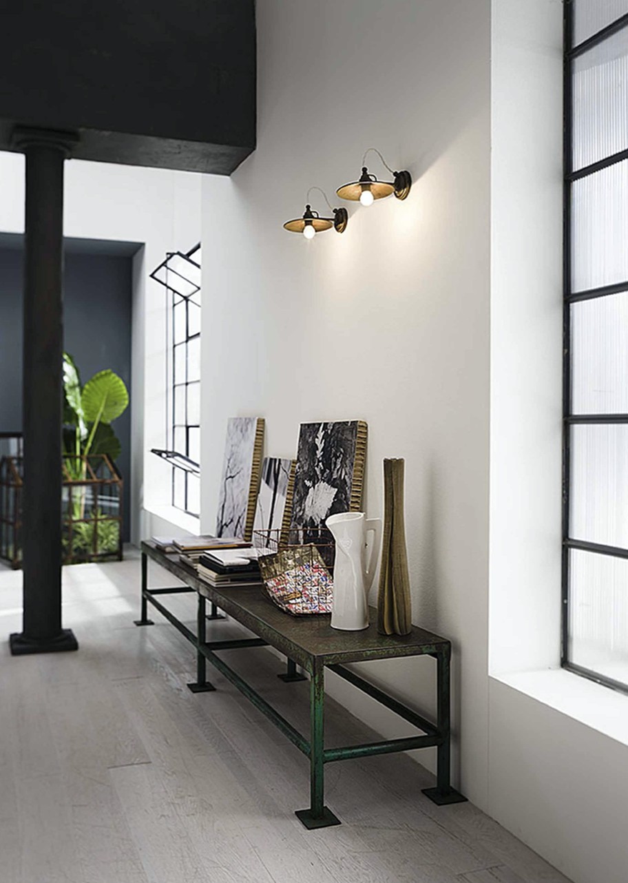 Un voluto richiamo all’arredo tipico di cantine e laboratori artigianali connota le lampade della collezione Cantina. Le forme essenziali sono la nota distintiva di ogni lampada, caratterizzata da un piatto levigato ottone o in ferro anticato. Prodotti moderni e versatili, che ben si inseriscono in differenti contesti. Disponibili in ottone (OO) o ferro (FF).