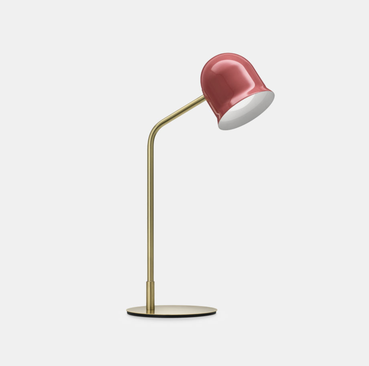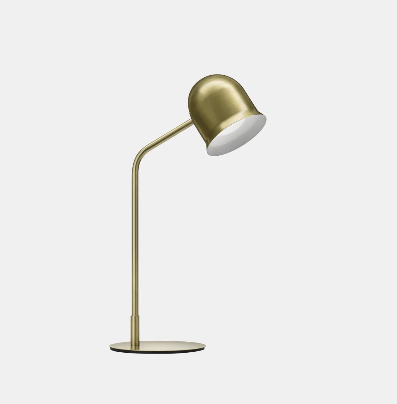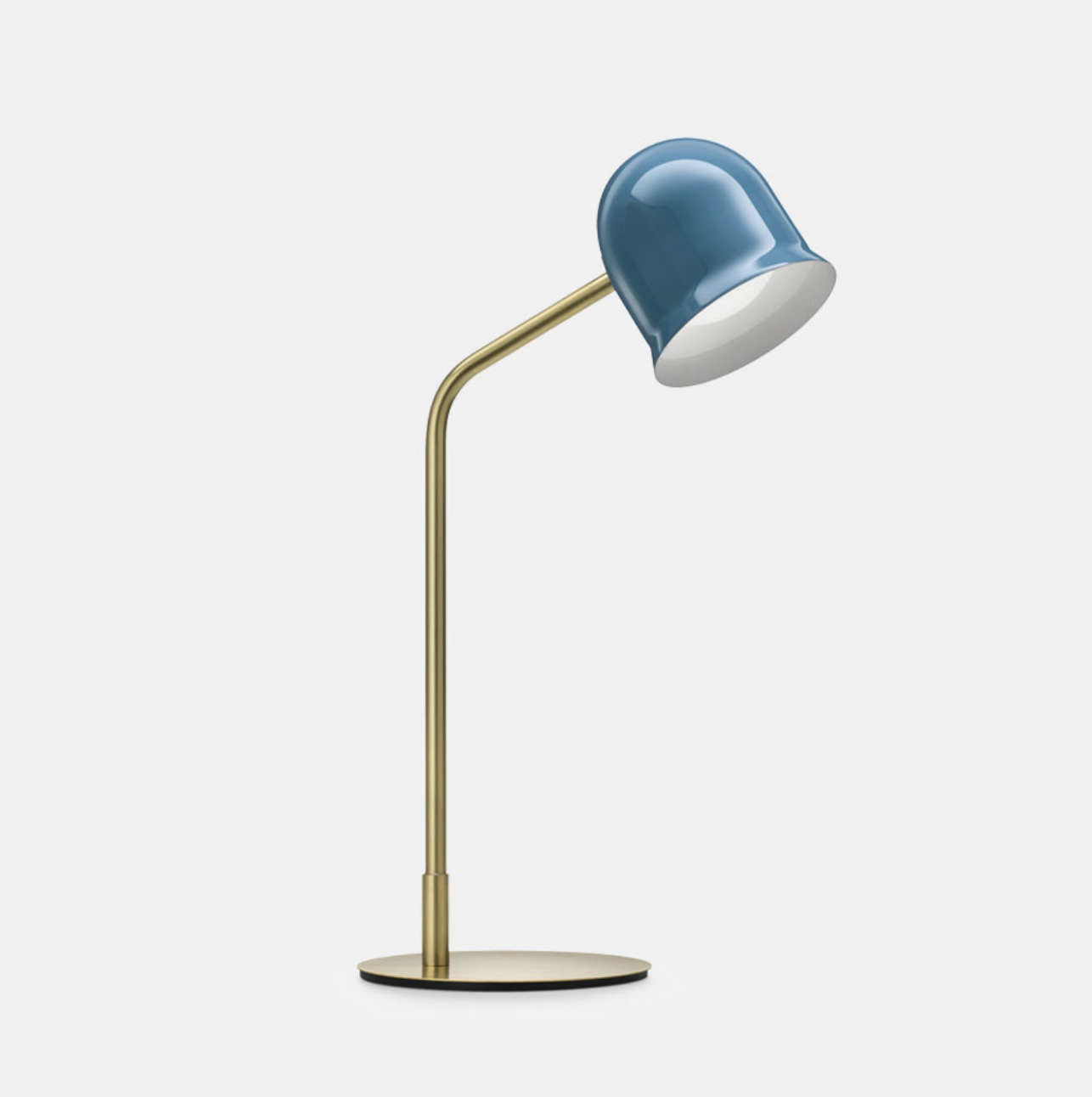 La forma della campana, depurata fino ad arrivare a volumi geometrici semplici, è utilizzata come corpo diffusore, realizzato tramite un’unica sapiente tornitura in metallo. Il volume così generato si posa su una sfera luminosa in vetro opalino, e grazie alla sua forma può essere orientato in qualsiasi direzione con un gesto semplice ed intuitivo.