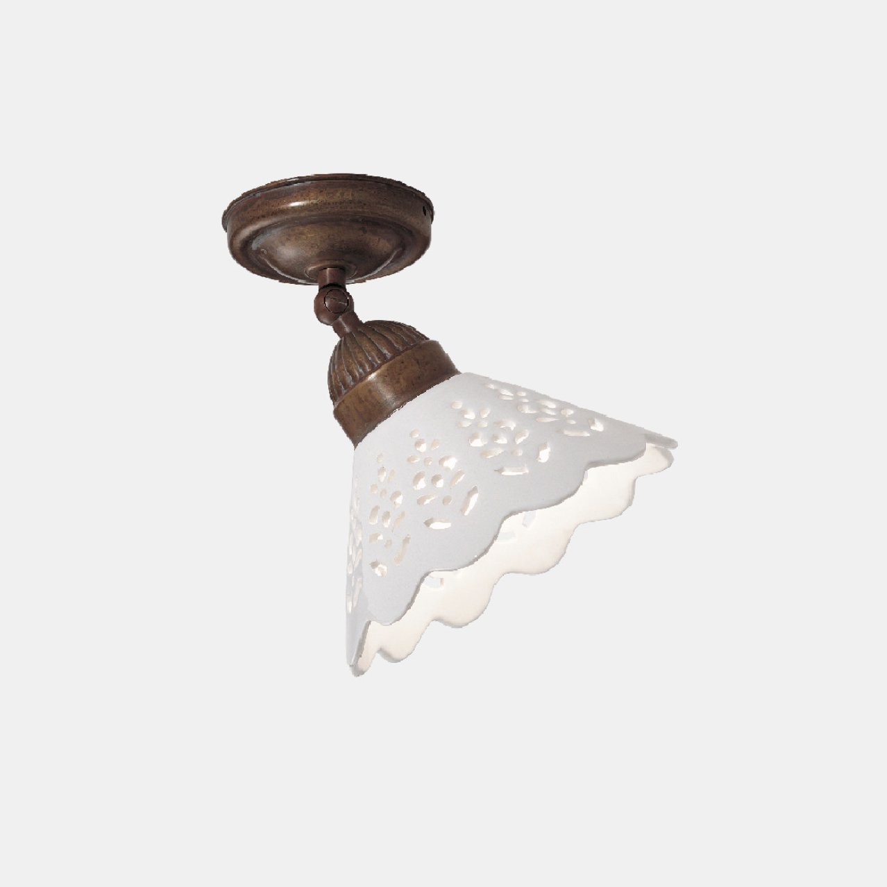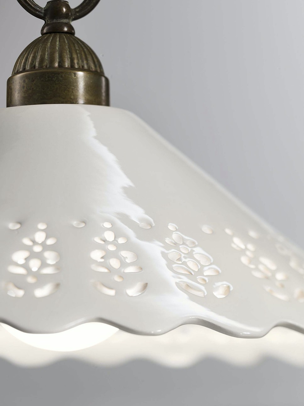 I ricami sapientemente traforati sulle preziose ceramiche di Bassano conferiscono un grande valore estetico alle lampade della collezione Fiori di Pizzo, emblemi di un classicismo rivisitato in chiave moderna. La ricercata lavorazione consente, in fase di illuminazione, la creazione di giochi di luce sulle pareti proiettando fiori e decori.