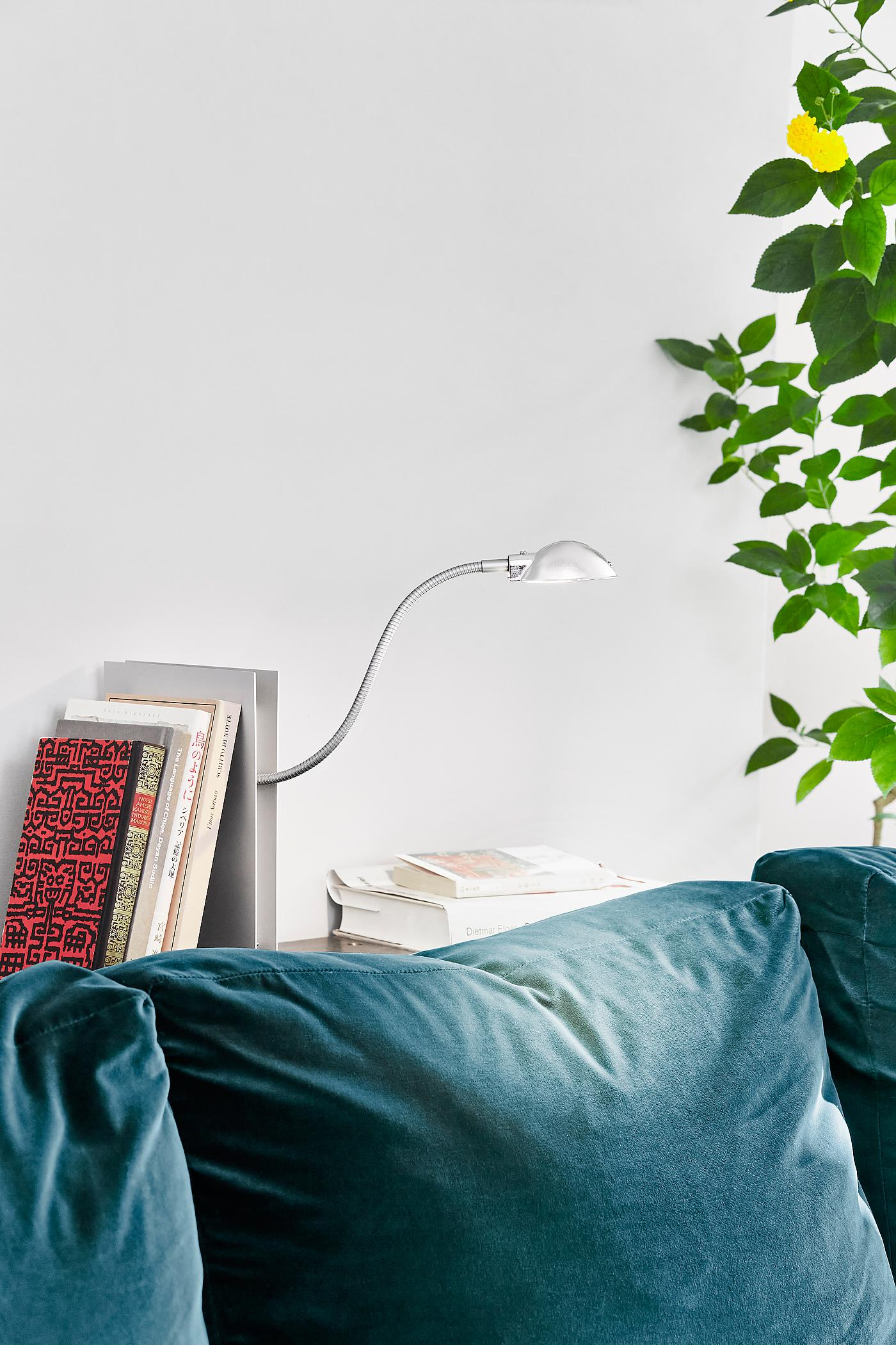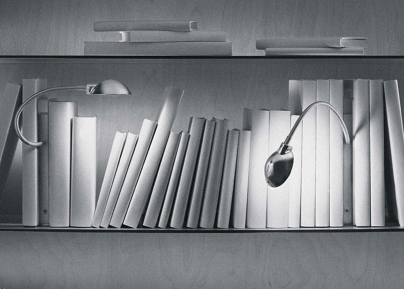 The body of the lamp serves as bookend. The flexible metal arm allows variable adjustment of the lamp head. Anodised aluminium in black or silver, metal.