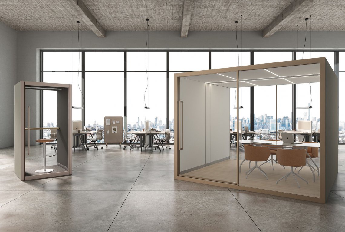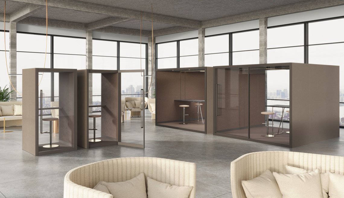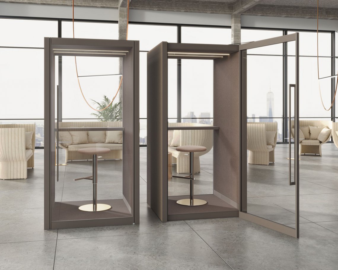 Privé is a system of soundproof, self-supporting booths, designed to create a private, protected area within open spaces, which are often noisy. It's both modular and customisable, and is the answer whenever privacy is required, be it visual or acoustic, making it possible to create the optimal working conditions.