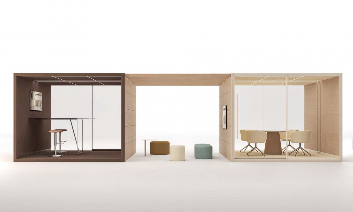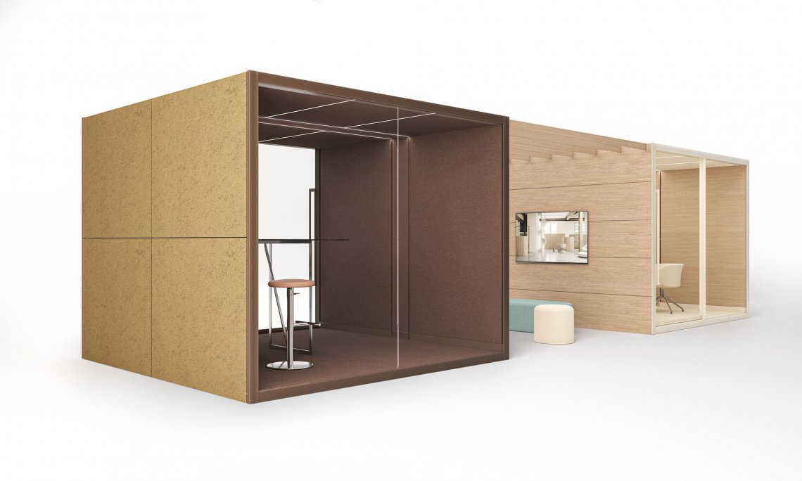 The meeting room version can accommodate tables for meetings or conference calls, monitors and whiteboards.