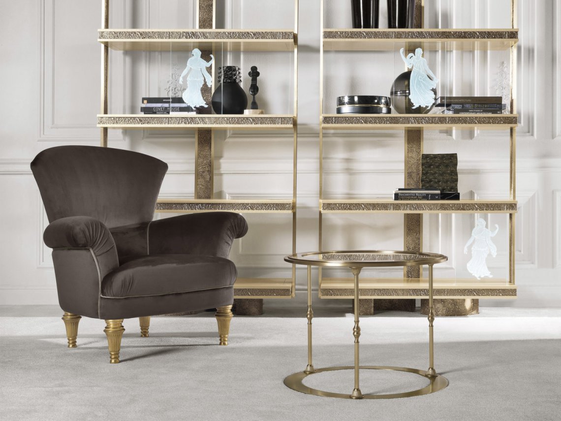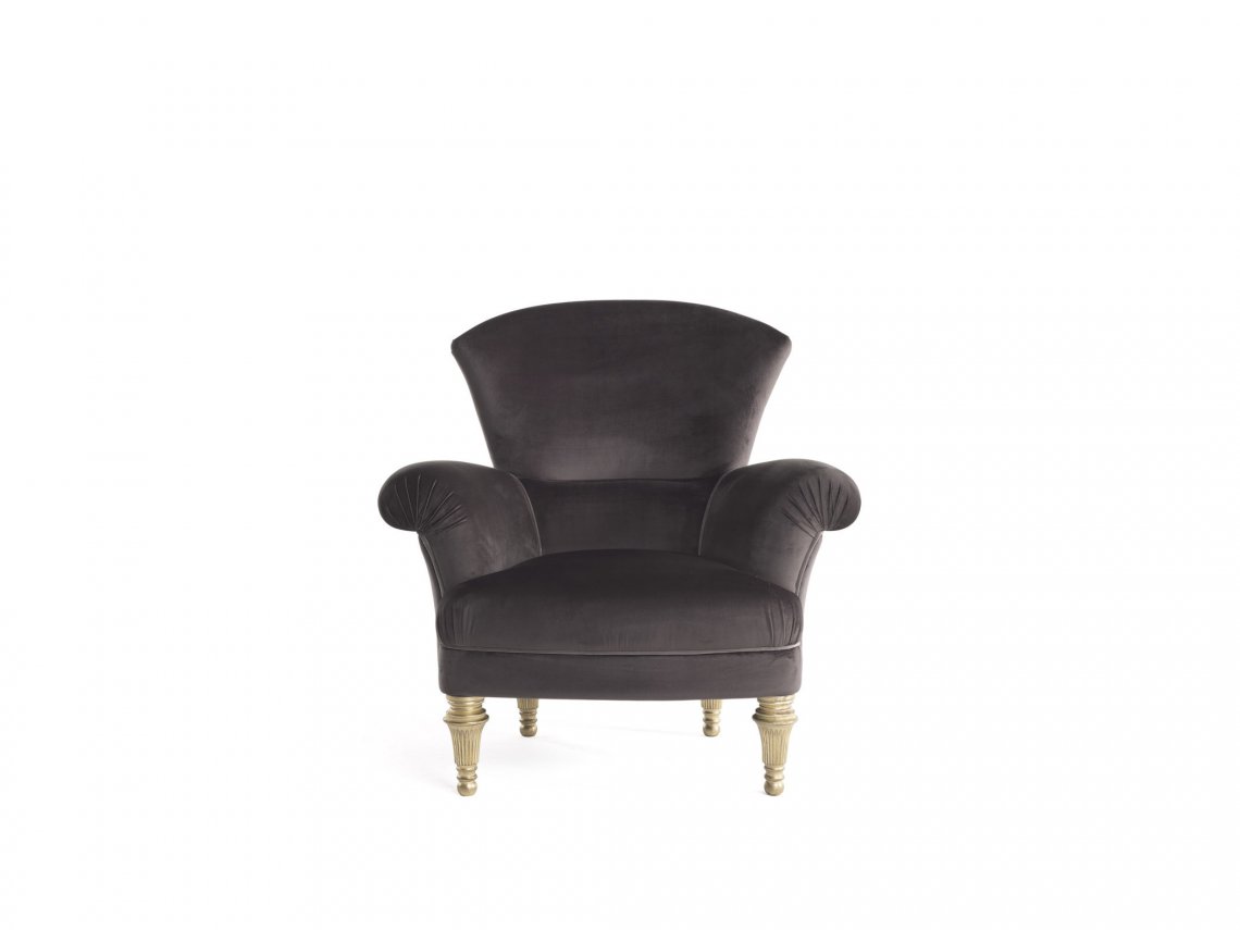 ARMCHAIR WITH STRUCTURE IN BEECHWOOD. PADDING IN FOAM. UPHOLSTERY IN FABRIC. FEET IN WOOD WITH PATINATED ANTIQUE GOLD FINISHING.