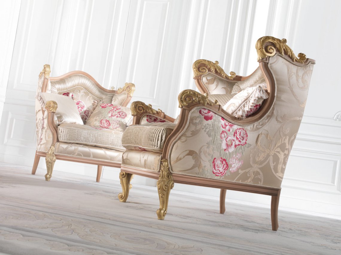 ARMCHAIR WITH STRUCTURE IN BEECHWOOD. PADDING IN FOAM. UPHOLSTERY IN FABRIC WITH DECORATIVE FRINGE.