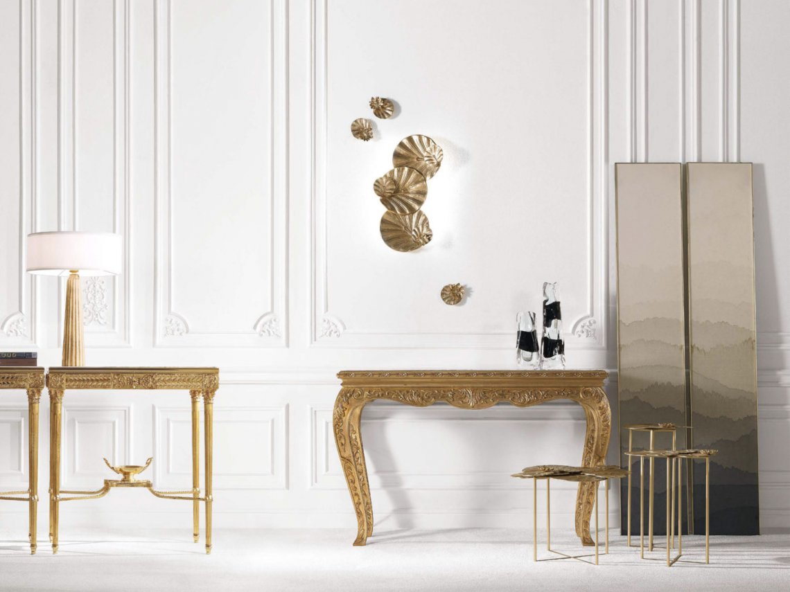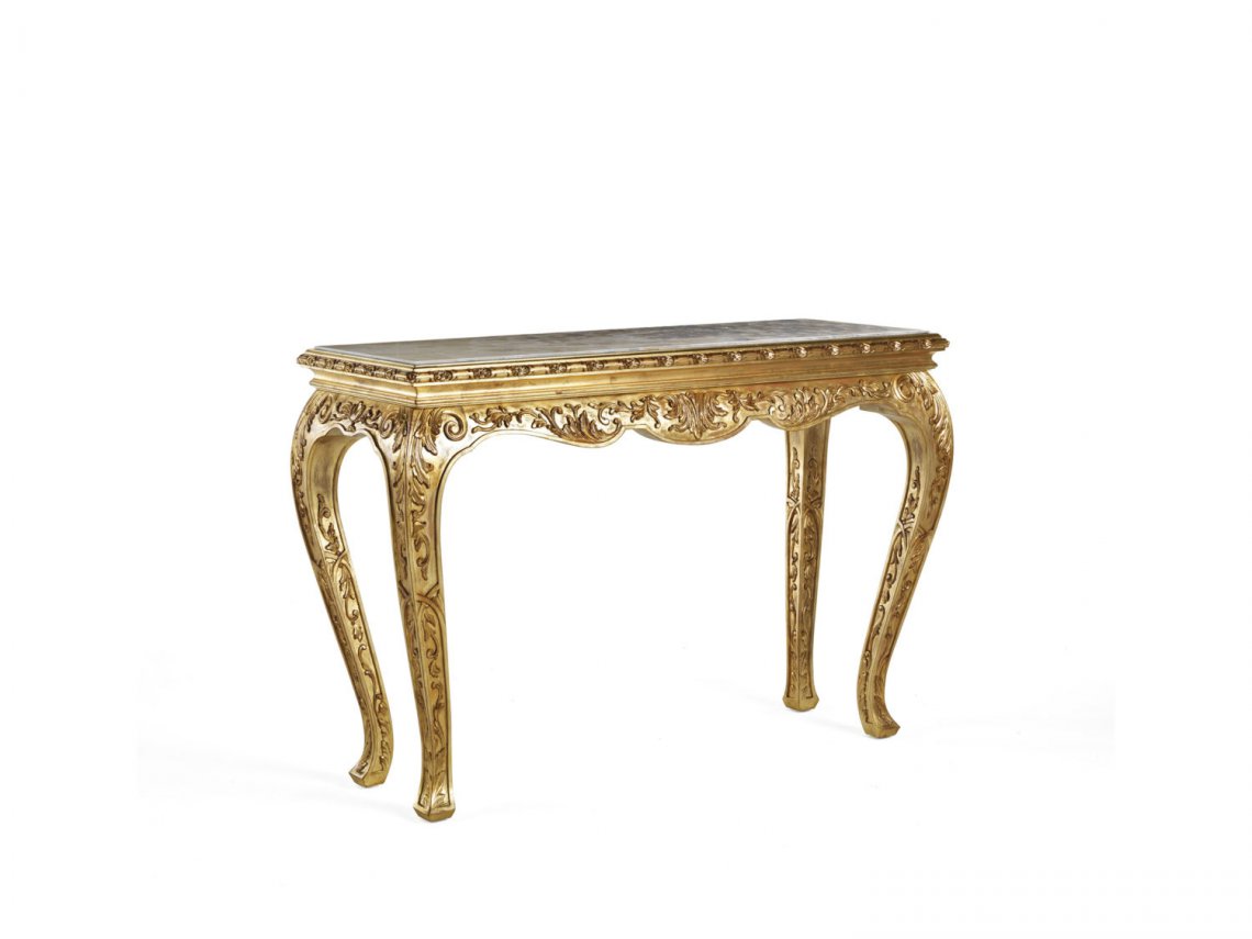 BAROQUE-STYLE CONSOLE WITH STRUCTURE IN BEECHWOOD. LOW RELIEF CARVINGS WITH PATINATED GOLD FINISHING. TOP IN CLOUDY ONYX.