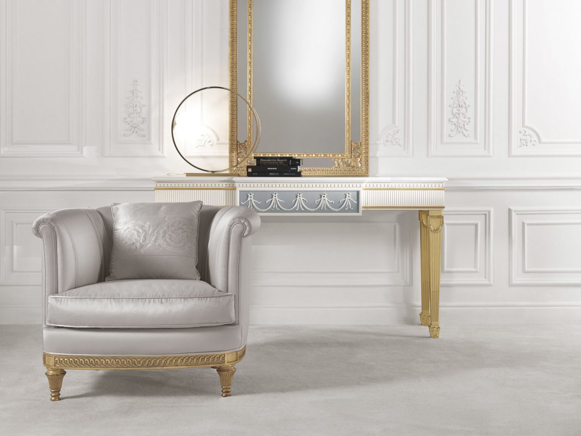 CONSOLE WITH STRUCTURE IN SOLID BEECHWOOD. DECORATIONS IN STYLE OF WEDGWOOD CERAMIC. WHITE AND GREY LACQUERED FINISHING WITH BISCUIT PORCELAIN EFFECT AND MATTE AND SHINY GOLD LEAF FINISHING. TOP IN WHITE STATUARIO MARBLE.